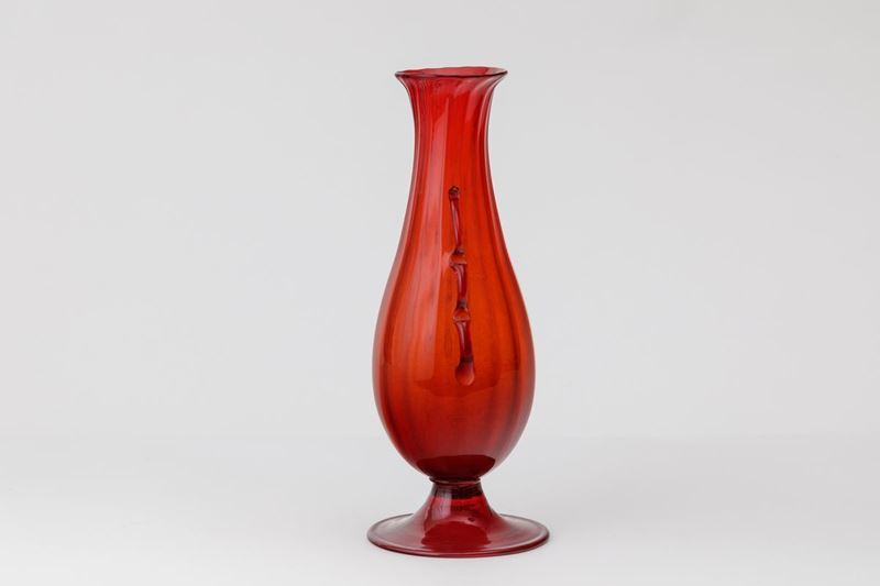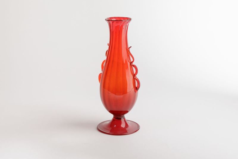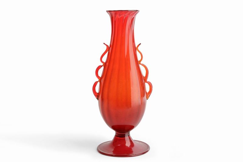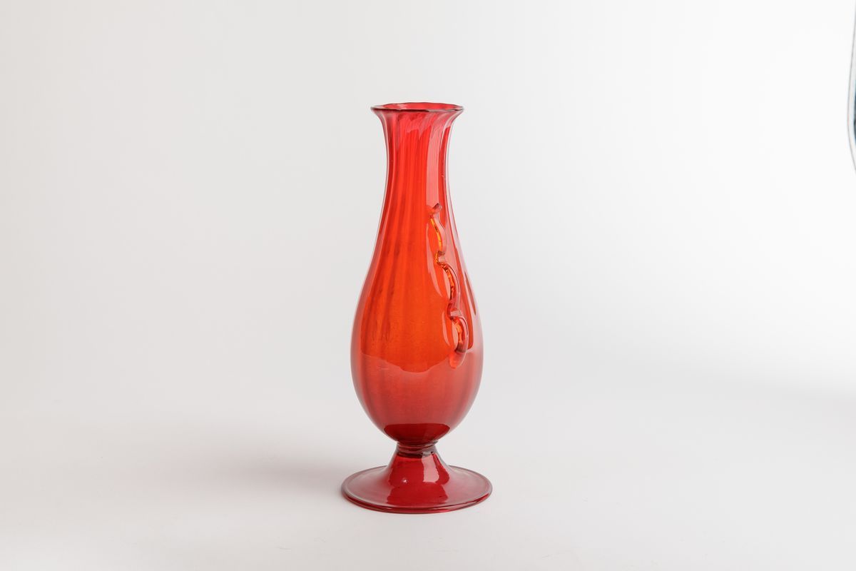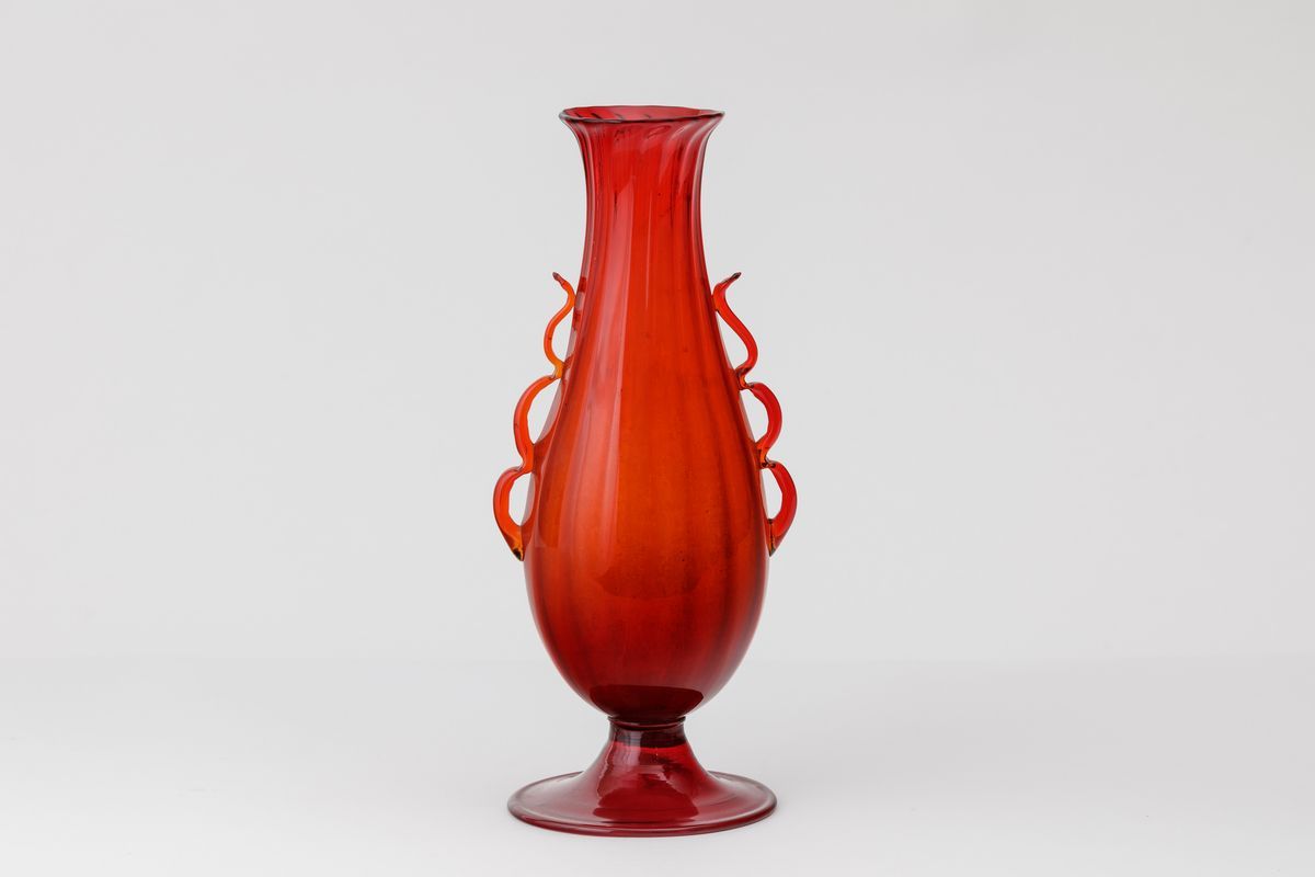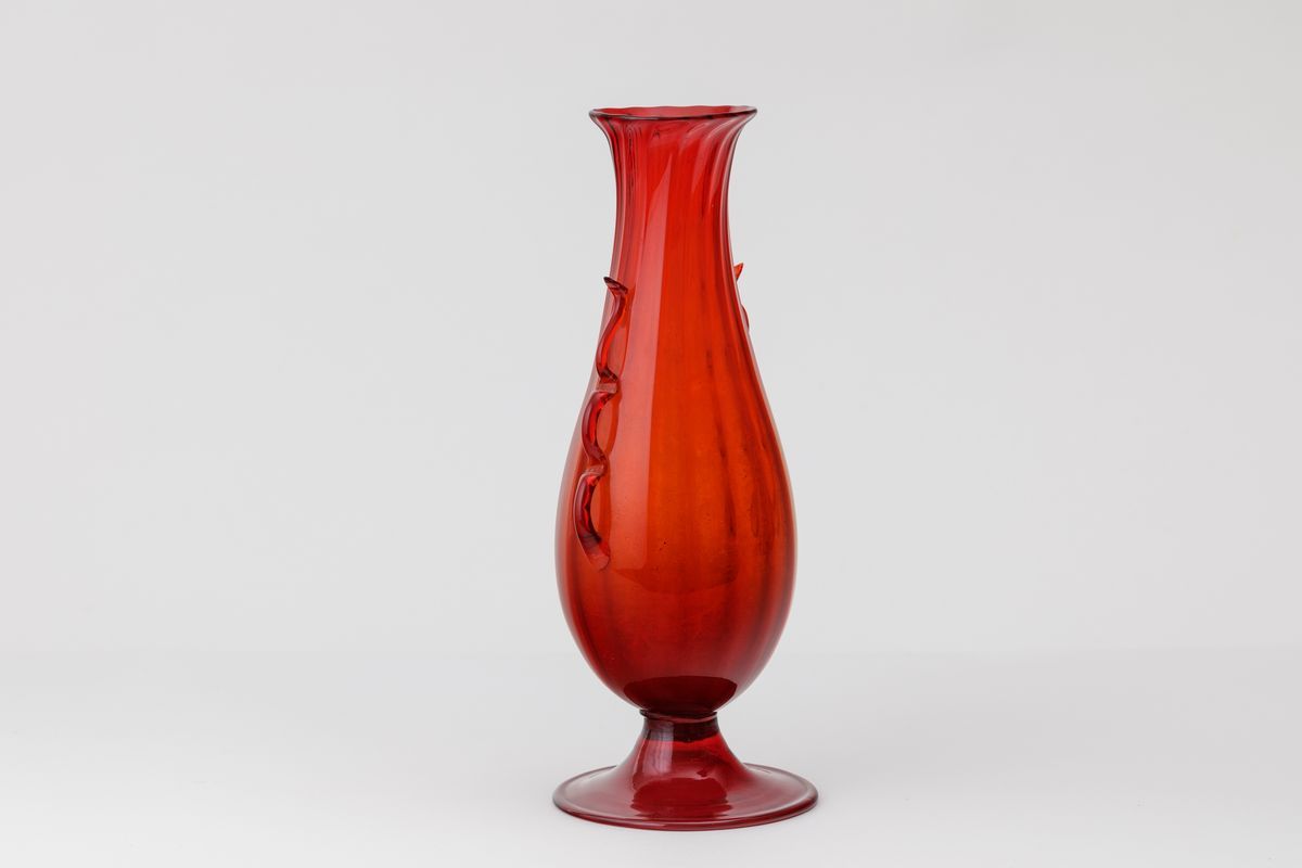 Vaso a balaustro in vetro soffiato costolato rosso con anse e piede applicato.