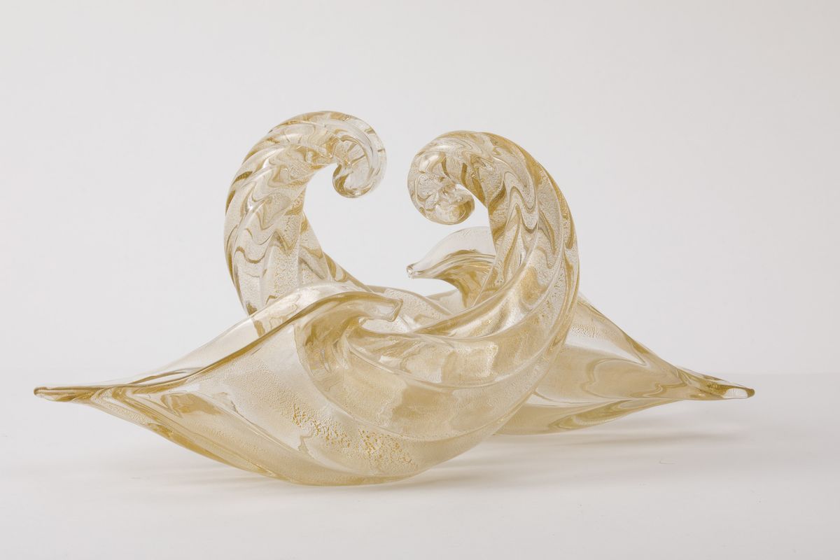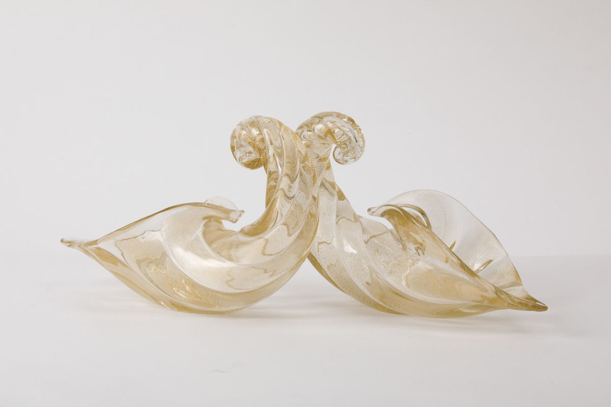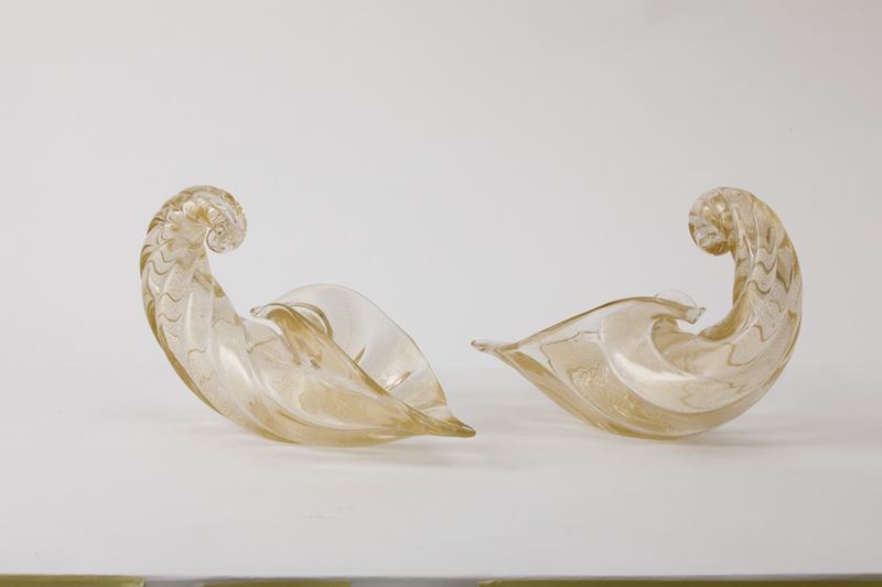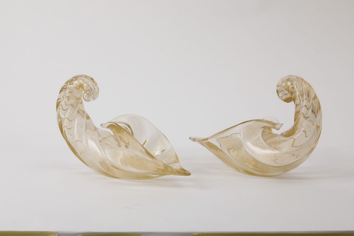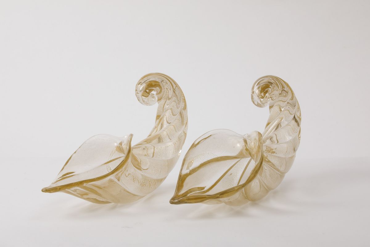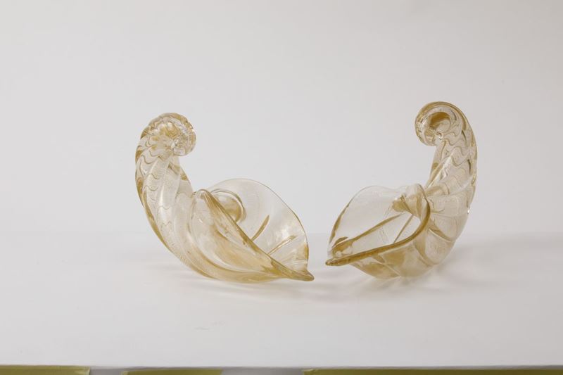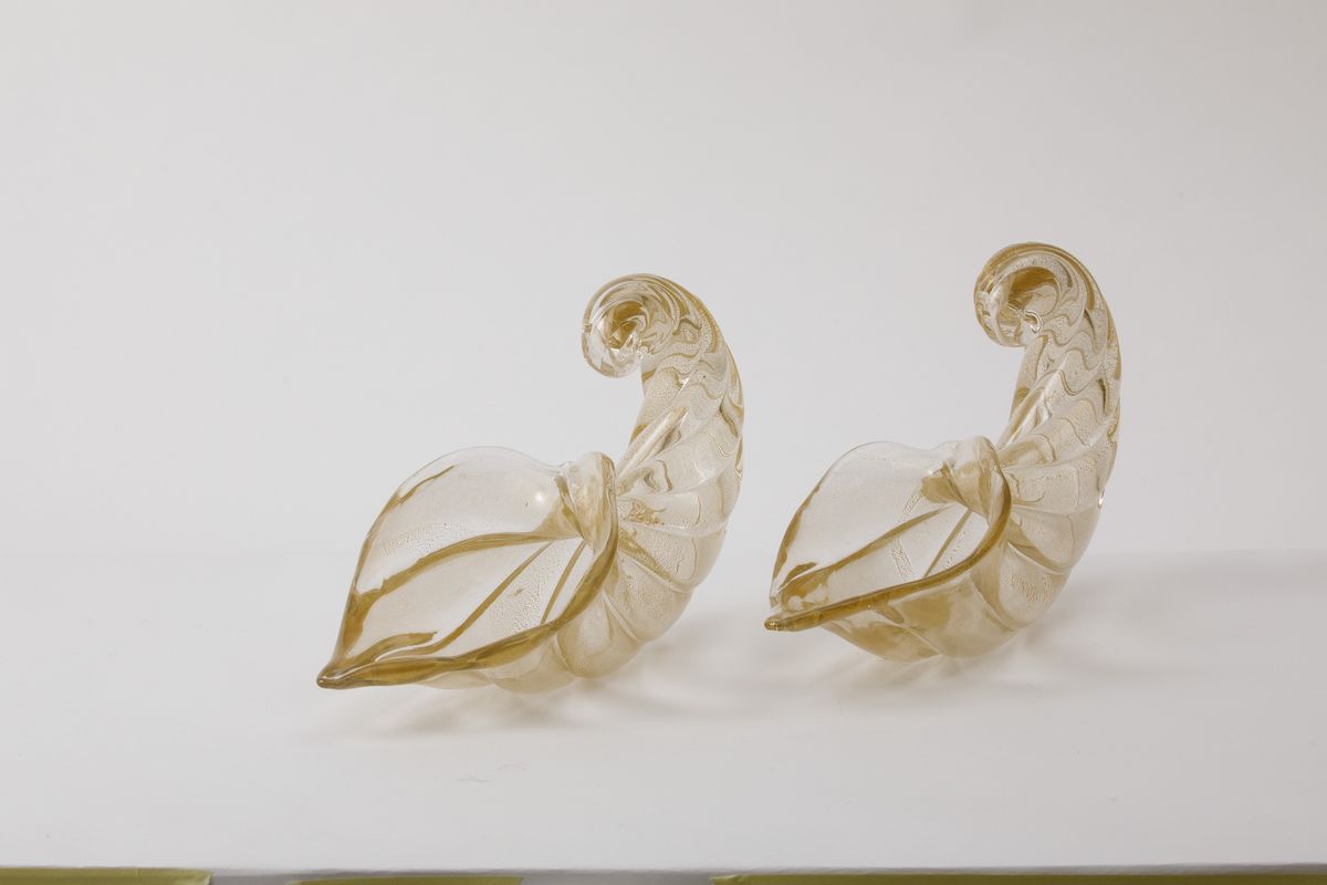 Coppia di cornucopie in vetro soffiato a grandi costolature con decoro di foglia oro sommersa.