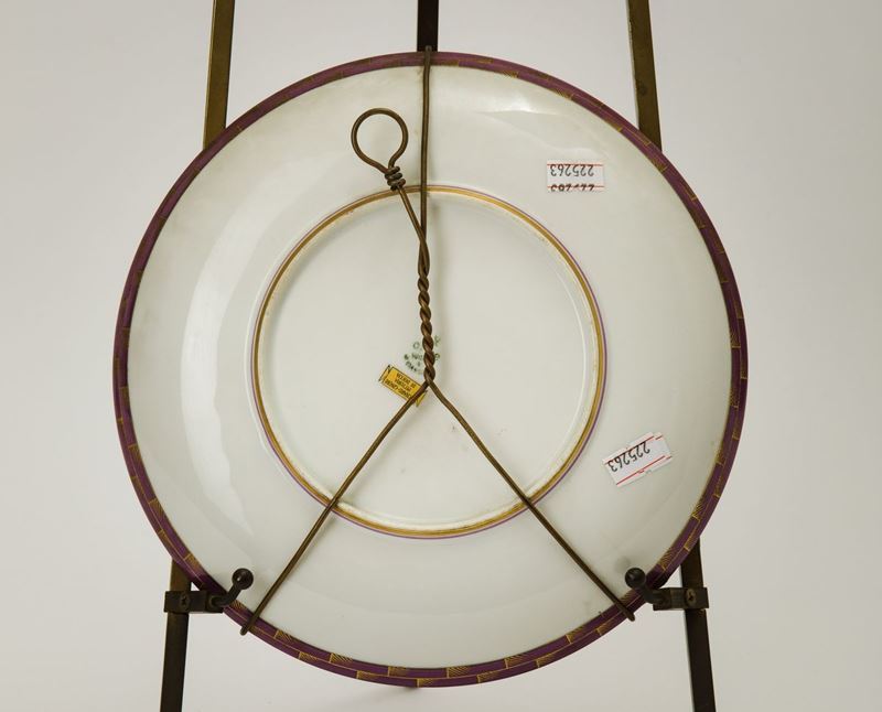 Piatto in porcellana bianca con figura femminile in colore viola e oro a punta d'agata. Filettatura e decorazione anche sul retro.
