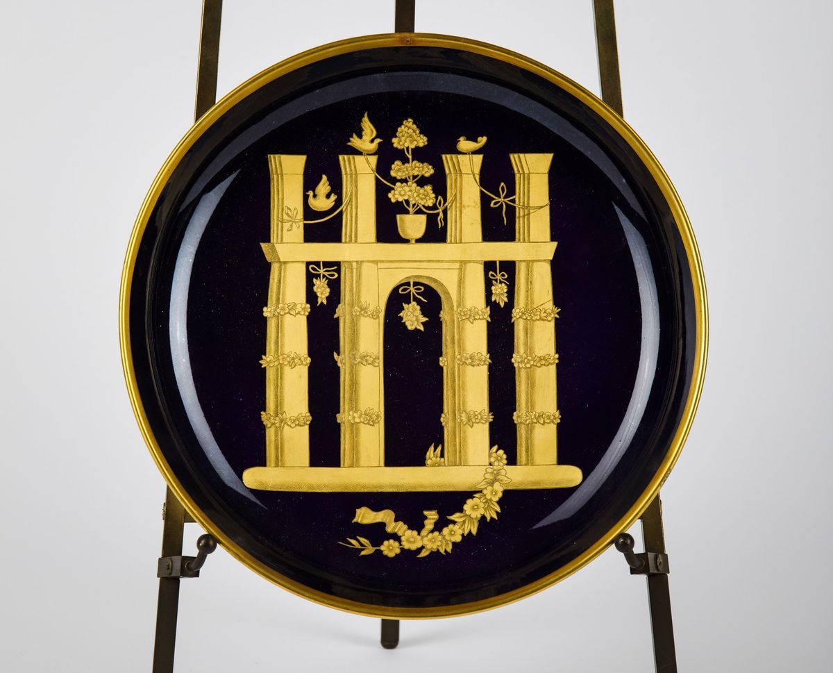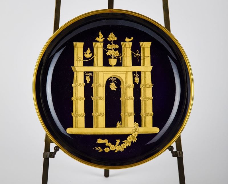 Piattella in porcellana bleu a gran fuoco e decoro in oro a punta d'agata di arco trionfale inghirlandato con tralci floreali, nastri e colombe.