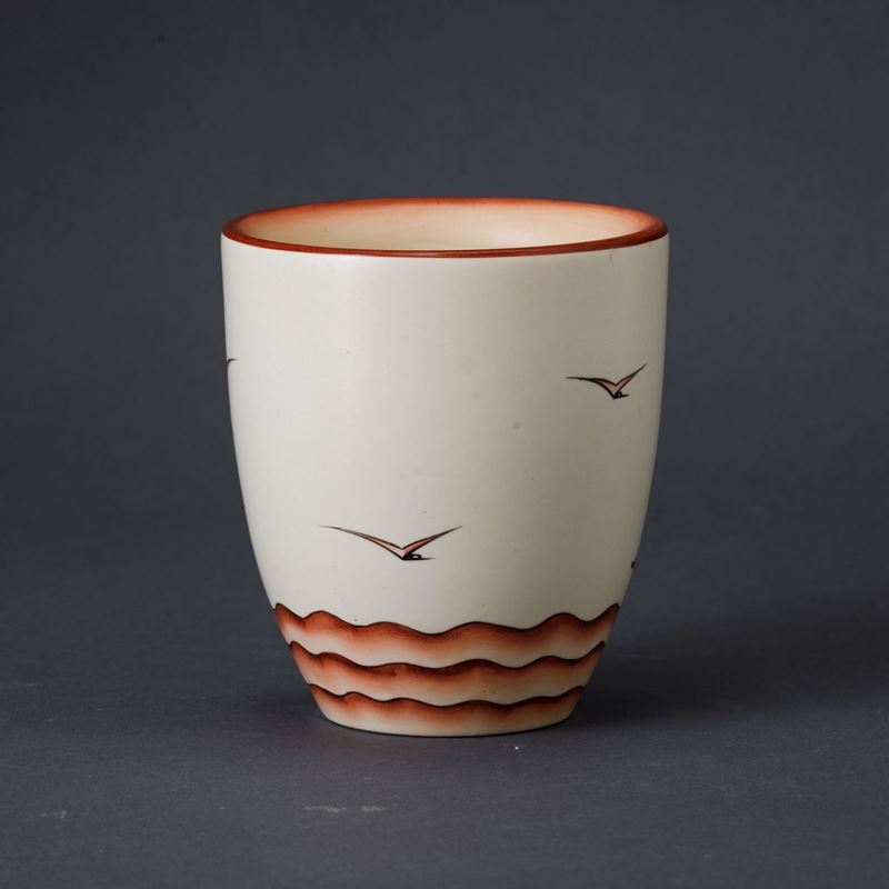 Piccolo vaso in terraglia a colaggio con decoro di veliero a smalti bicolore.
