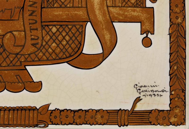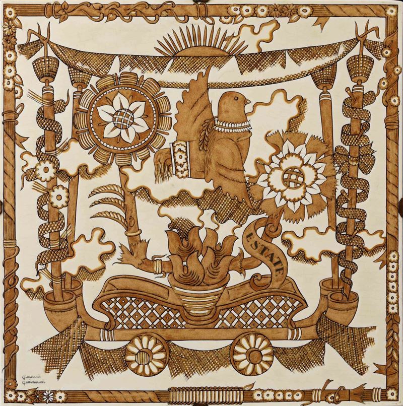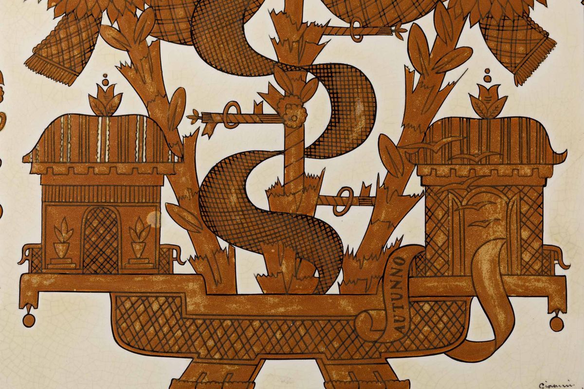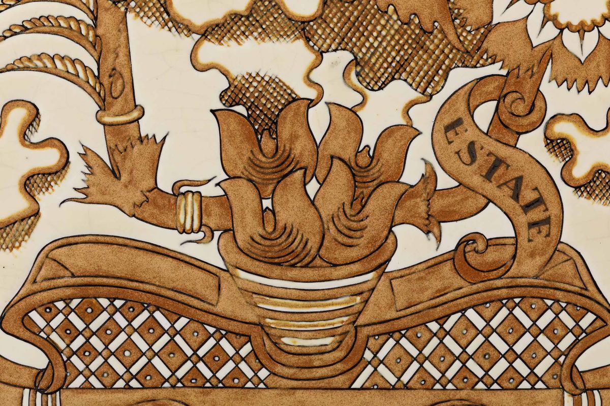 Rara serie di quattro grandi placche decorative in terraglia a colaggio con raffigurazione fantastica delle quattro stagioni decorate a graffito e smalto monocromo.