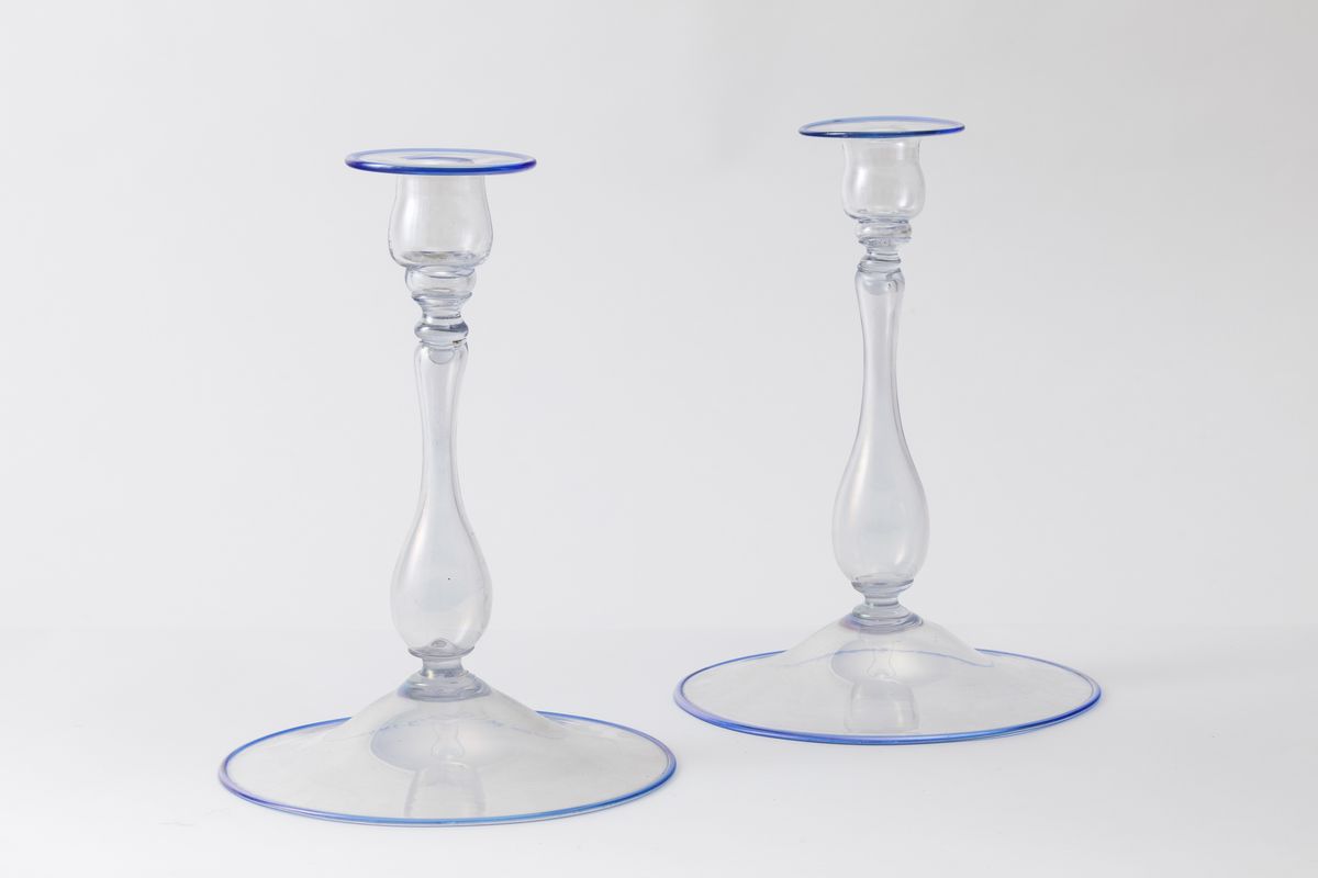 Eccezionale coppia di candelieri a balaustro in vetro soffiato iridato con cordoni applicati azzurrini.