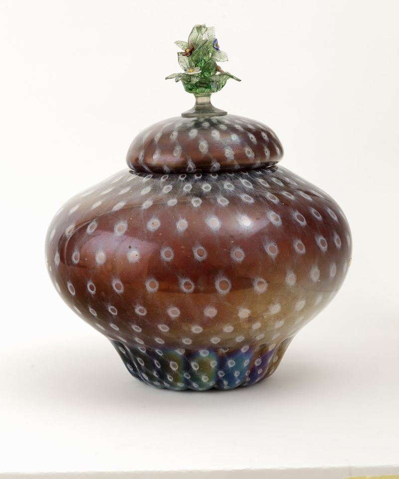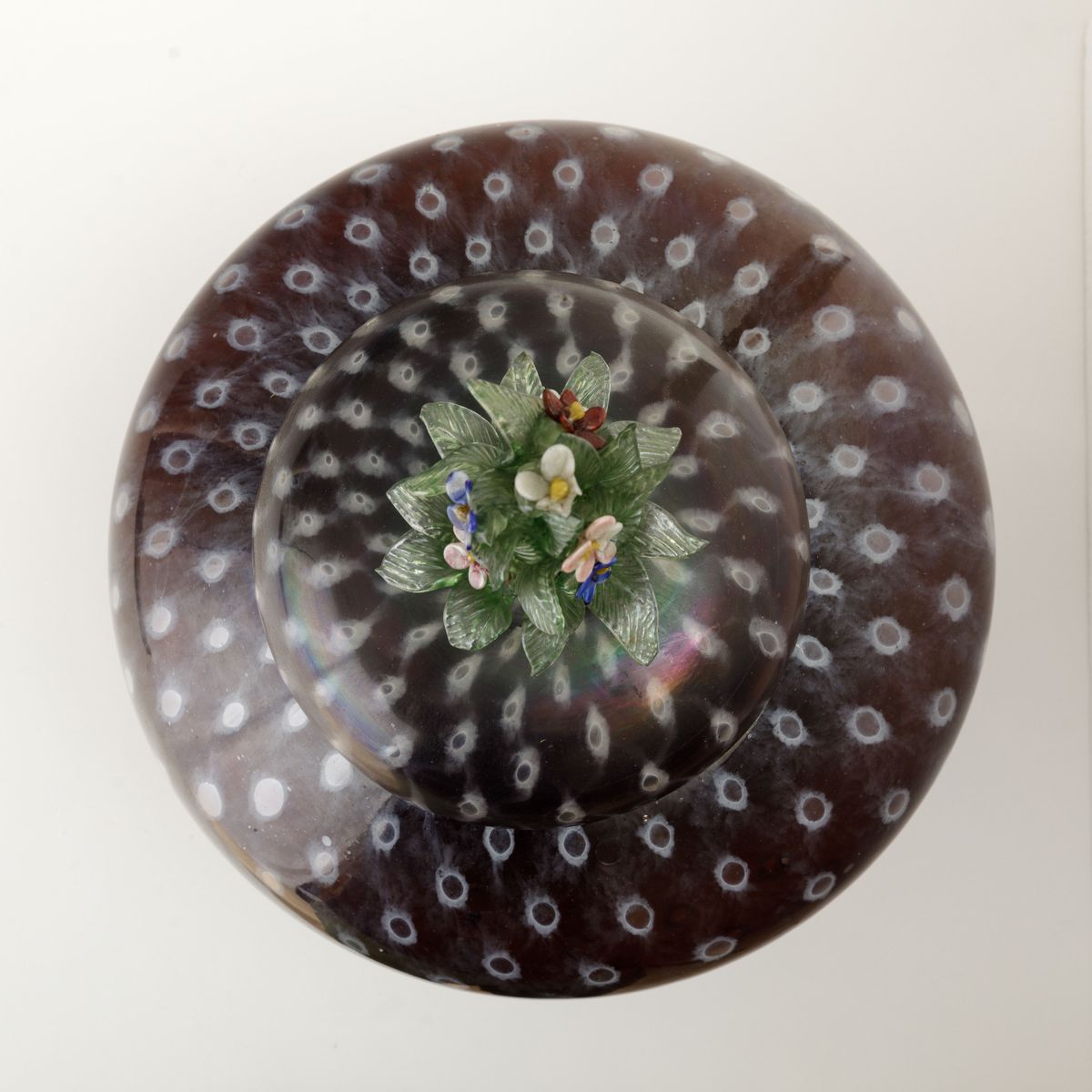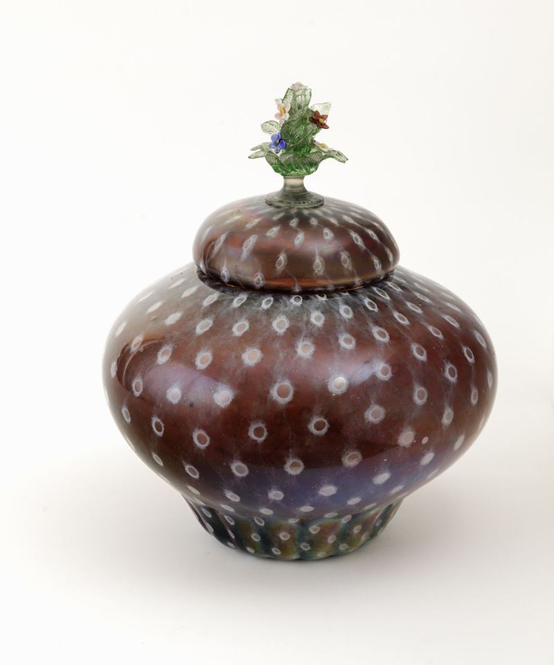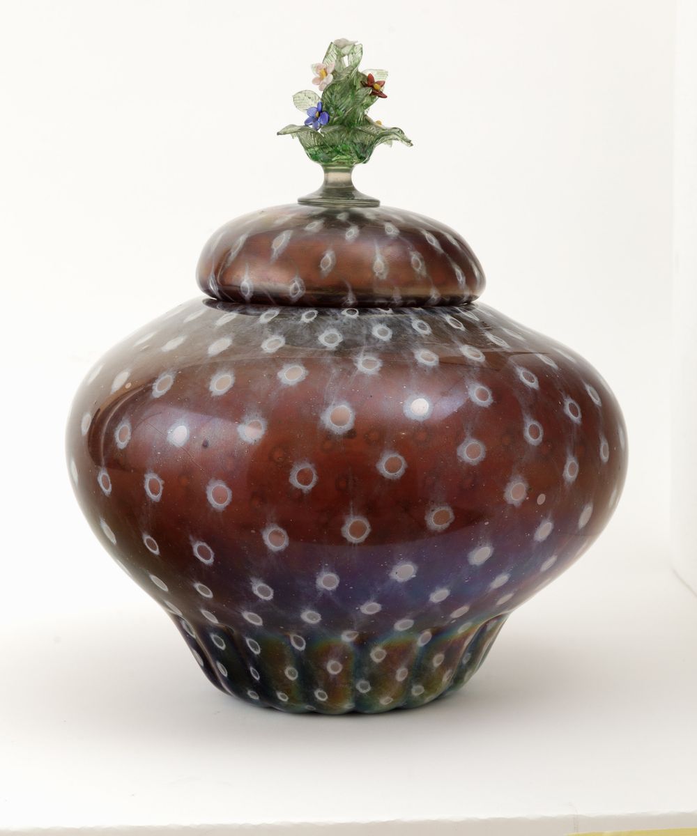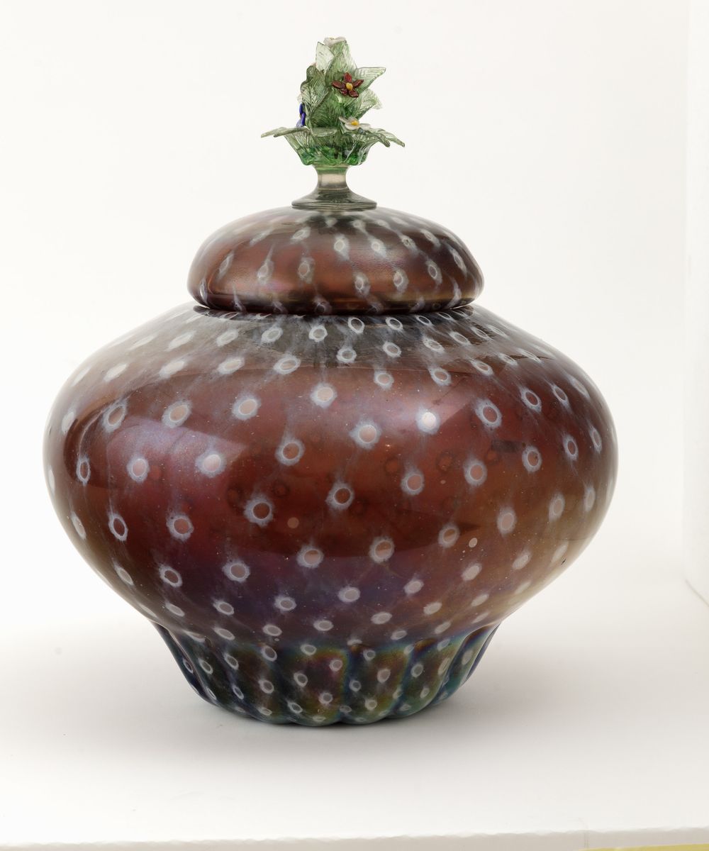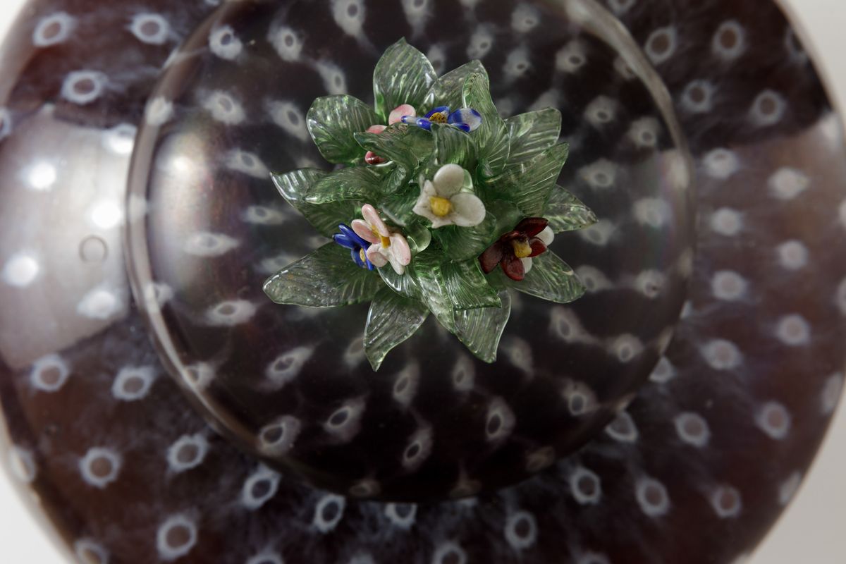 Eccezionale compostiera in vetro soffiato in stampo costolato con decoro a coda di pavone costituito da bolle soffiate contornate da alone opalescente. Terminale a bouquet di fiori e foglie in vetro policromo.