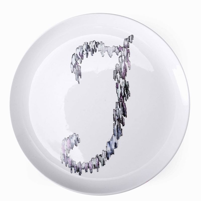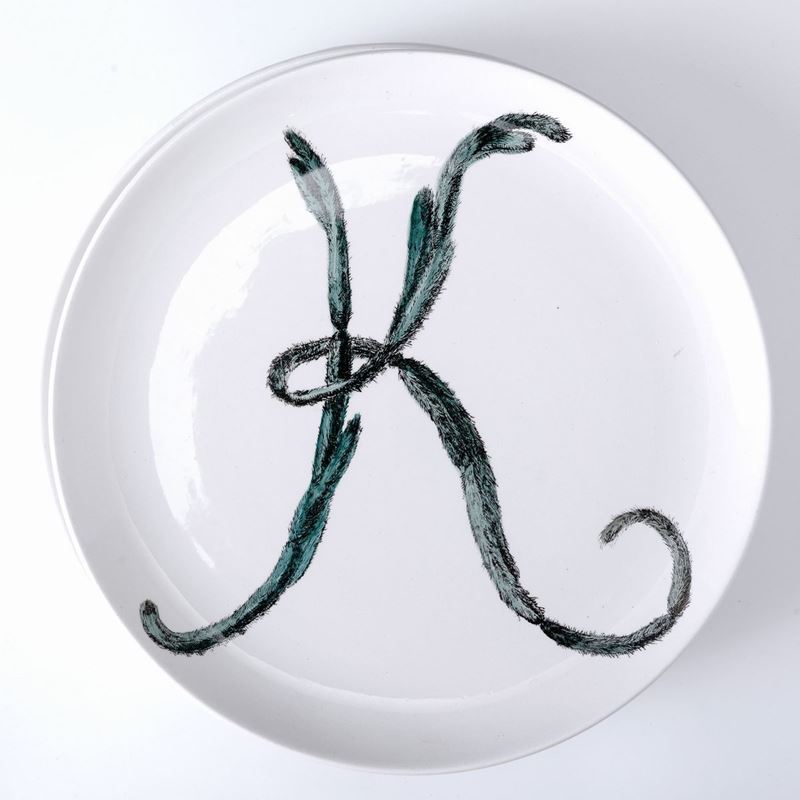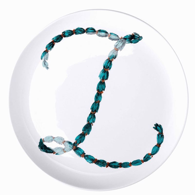 Quattro piatti in terraglia serie Lettere con decoro serigrafato e dipinto a mano con ortaggi.