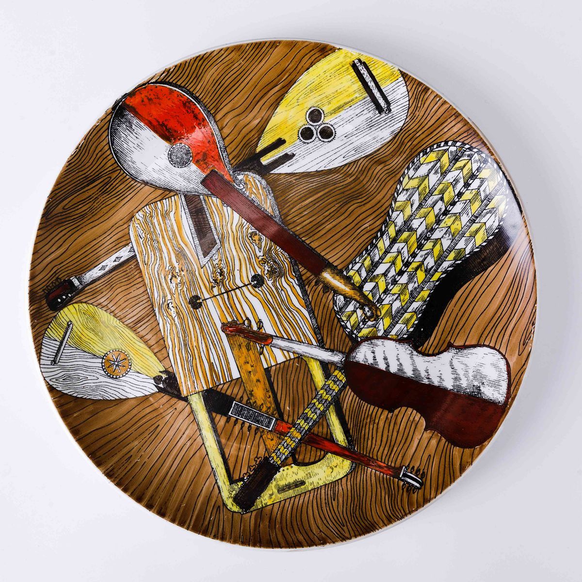 Lotto formato da tre piatti rari serie Strumenti musicali in porcellana con decoro serigrafato e dipinto a mano. diametro cm 26