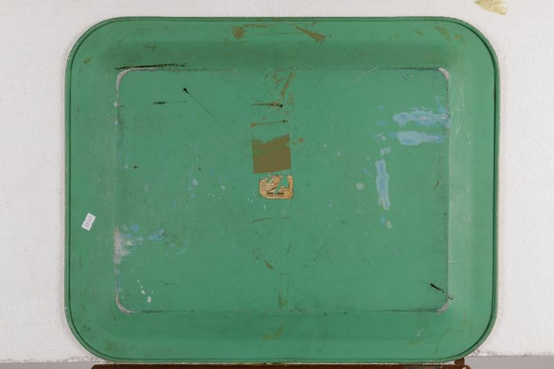 Raro vassoio in latta con decoro serigrafato di maschere della Commedia dell'Arte.