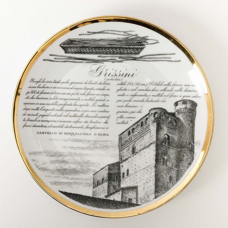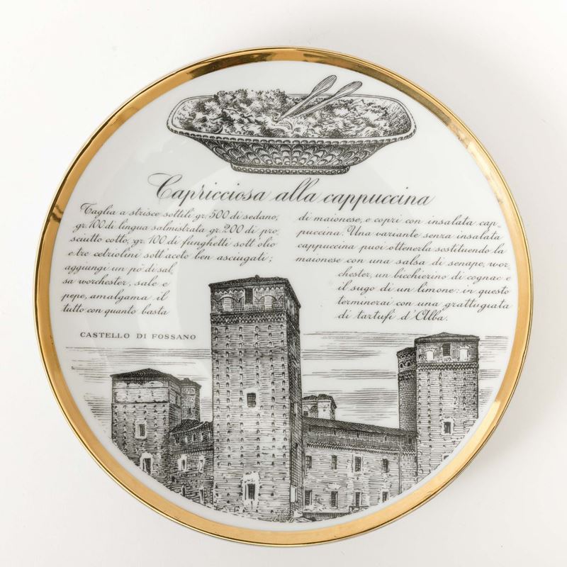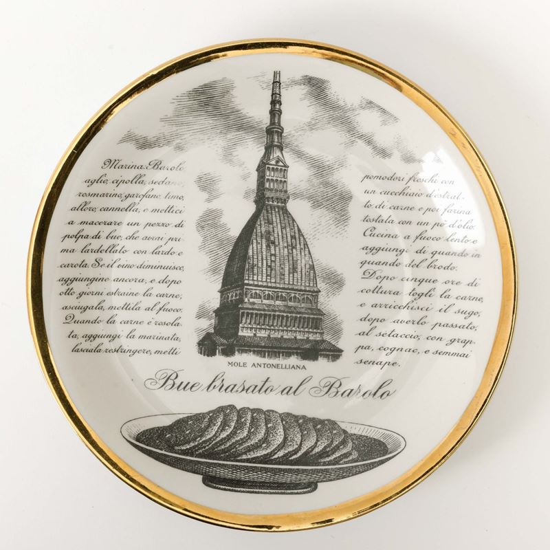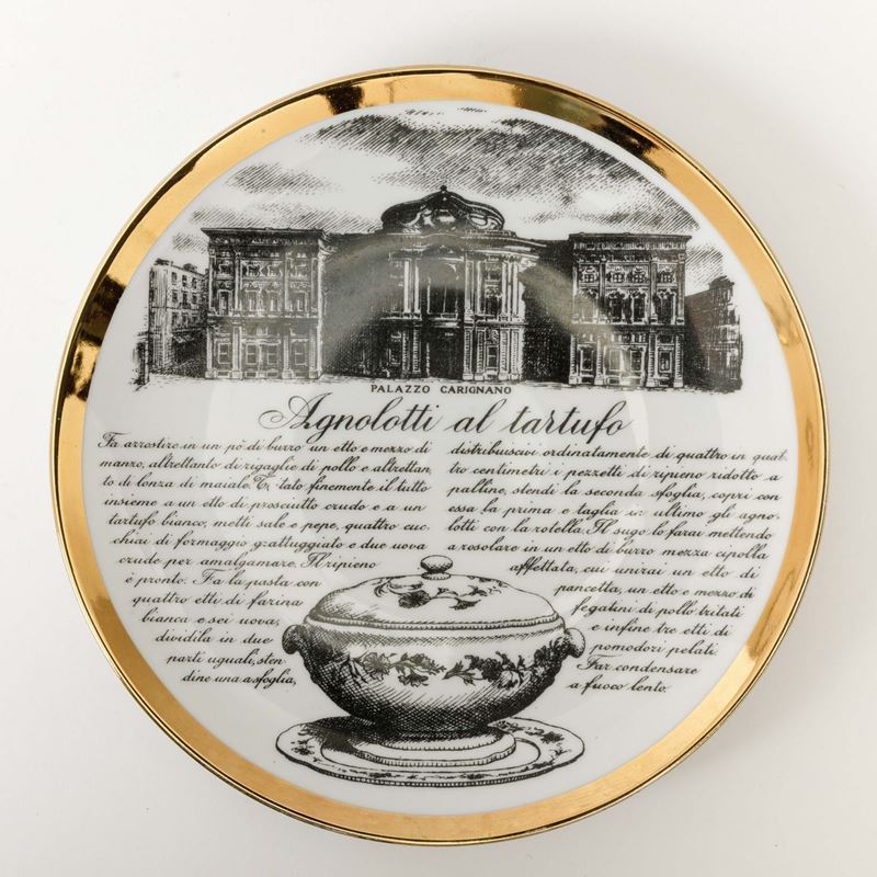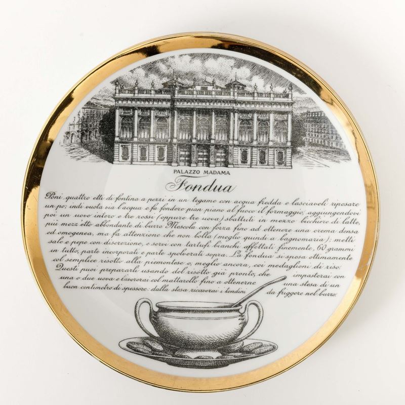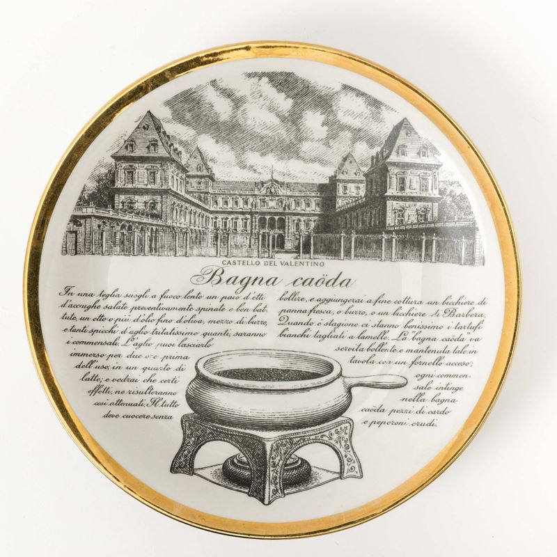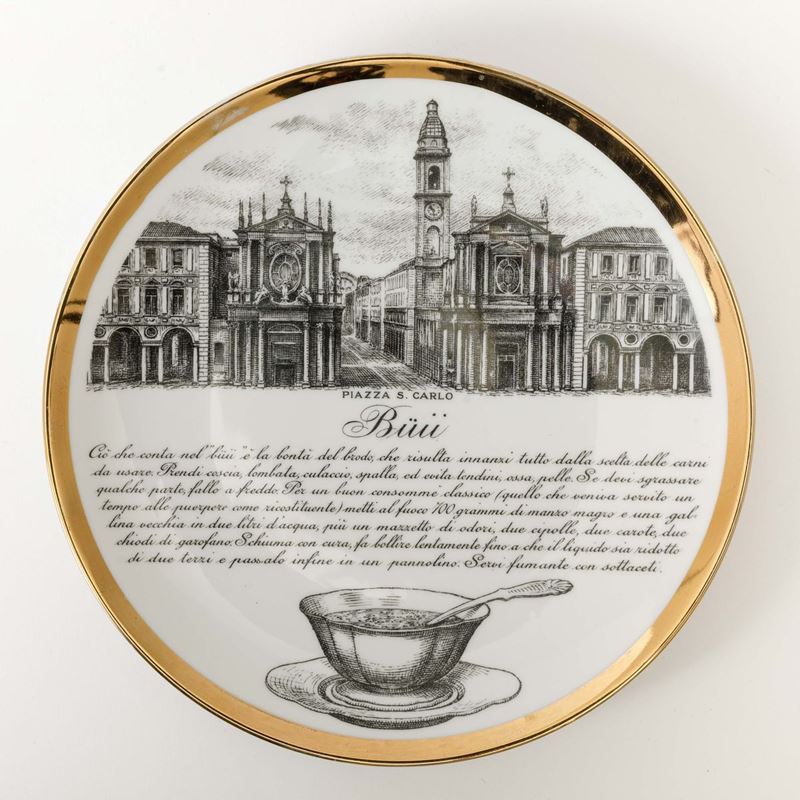Lotto di dodici piatti con ricette gastronomiche serie Specialità Torinesi in porcellana con decoro serigrafato e bordo in oro.