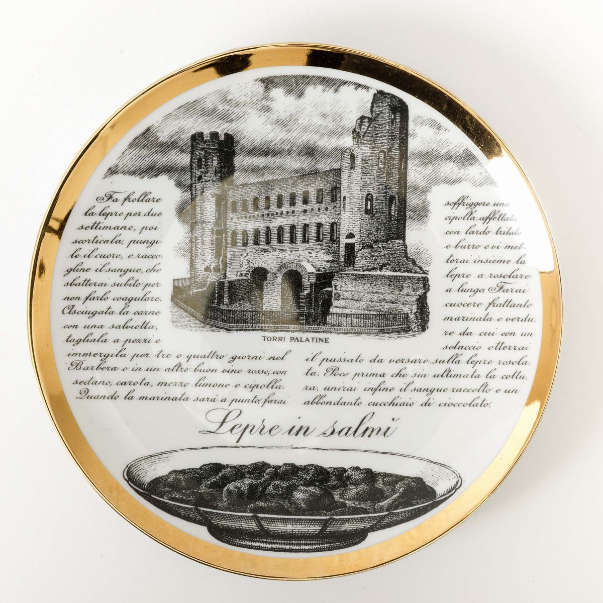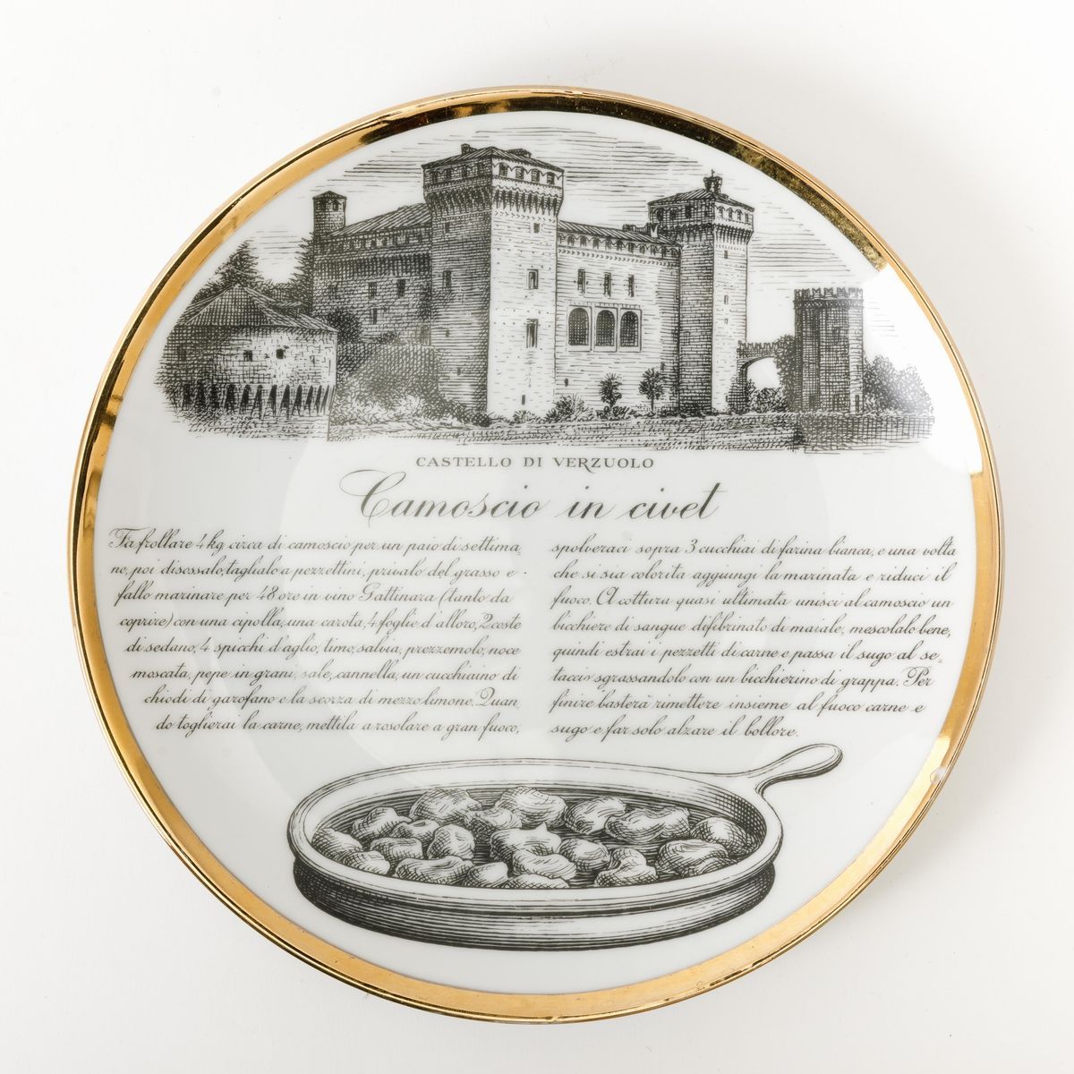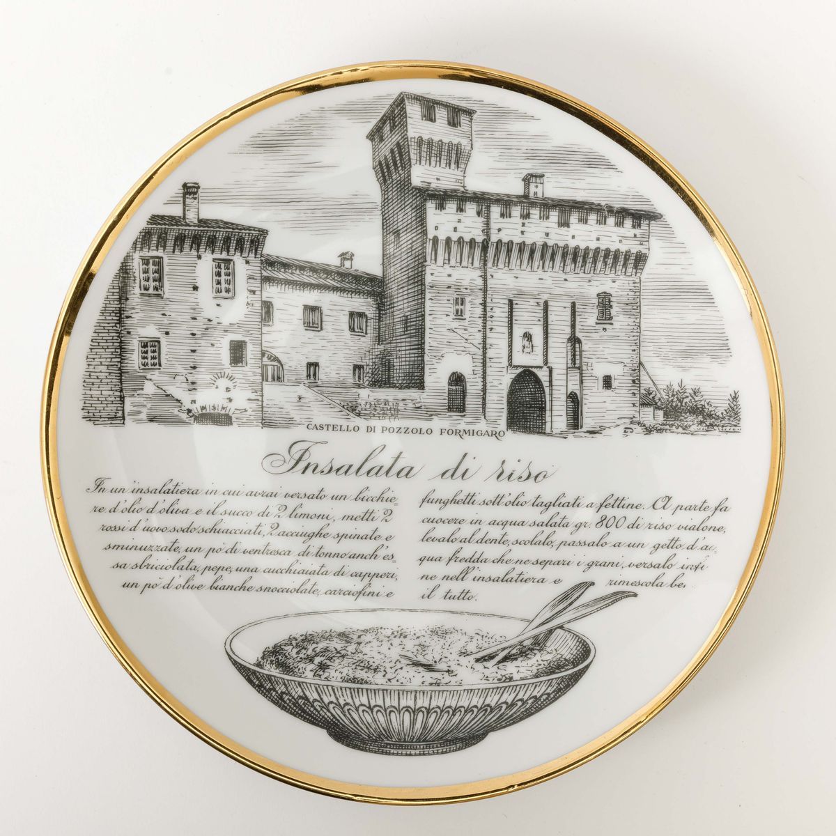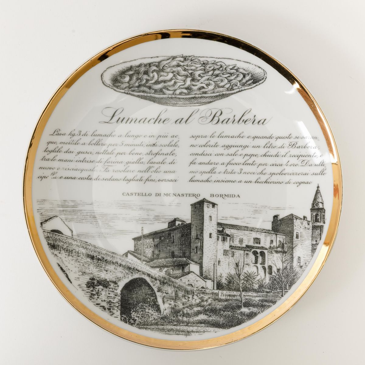 Lotto di dodici piatti con ricette gastronomiche serie Specialità Torinesi in porcellana con decoro serigrafato e bordo in oro.