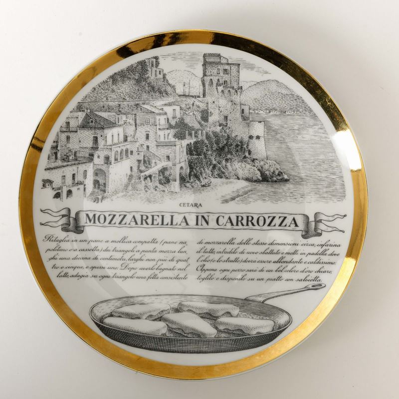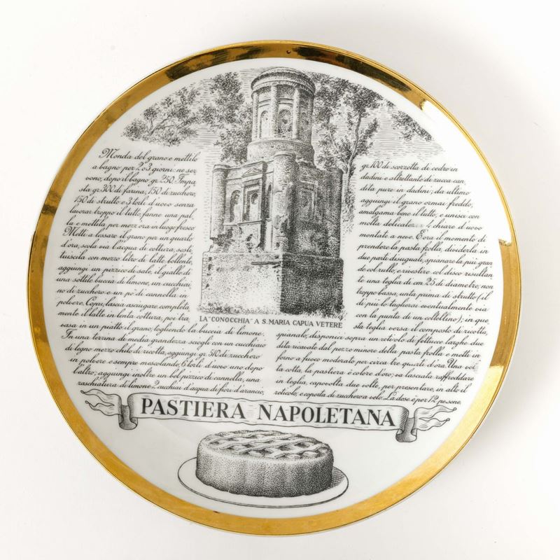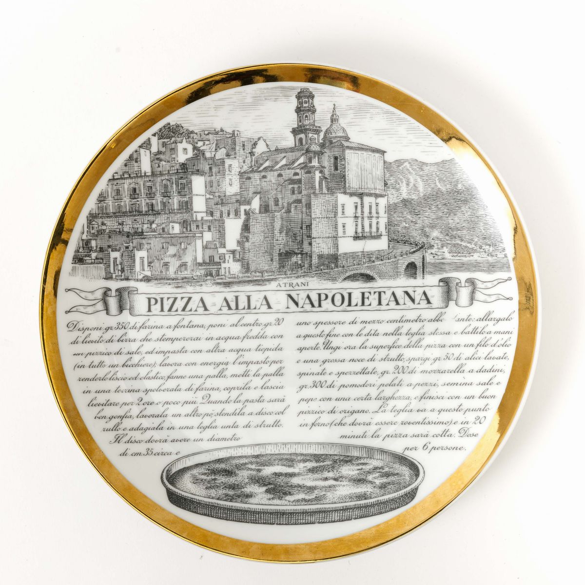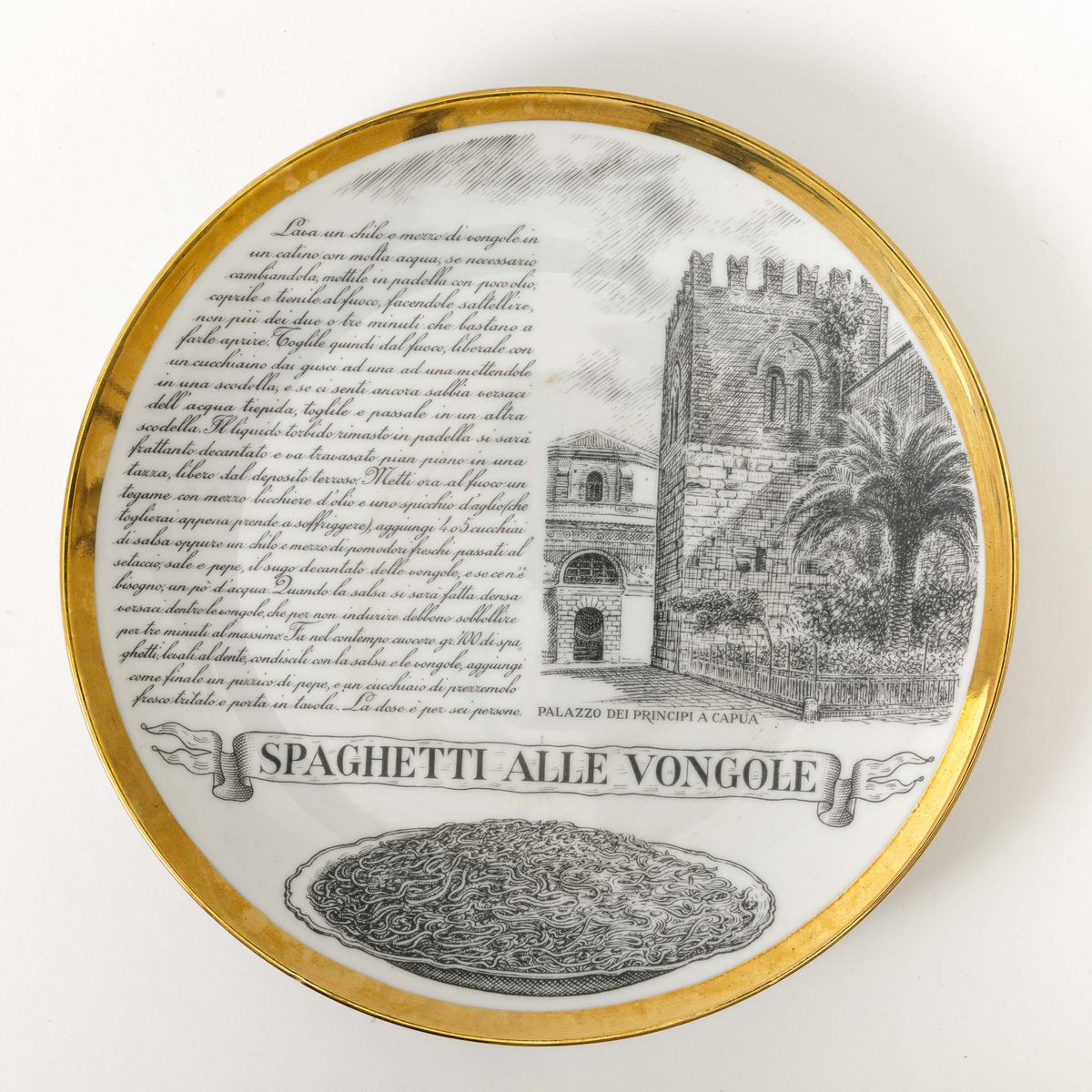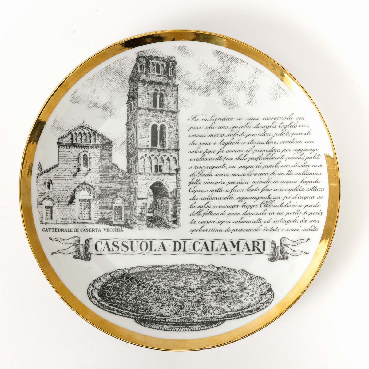 Lotto di sei piatti con ricette gastronomiche serie Specialità Napoletane in porcellana con decoro serigrafato e bordo in oro.