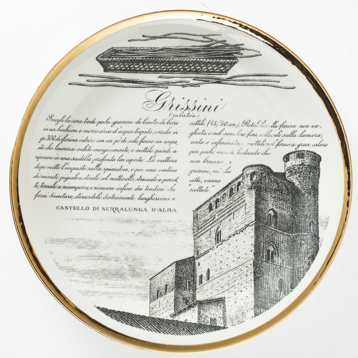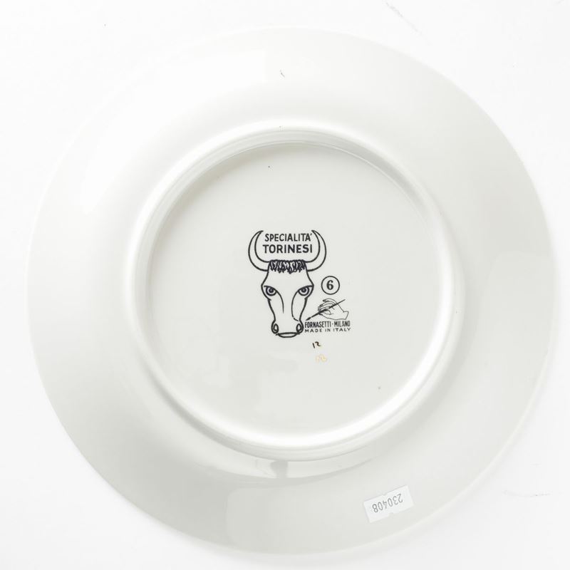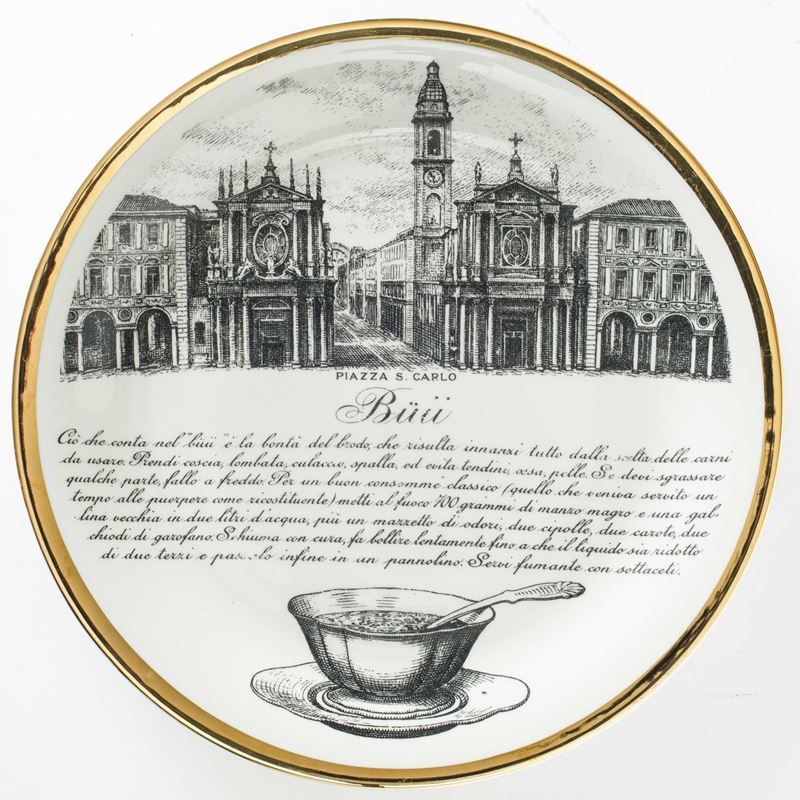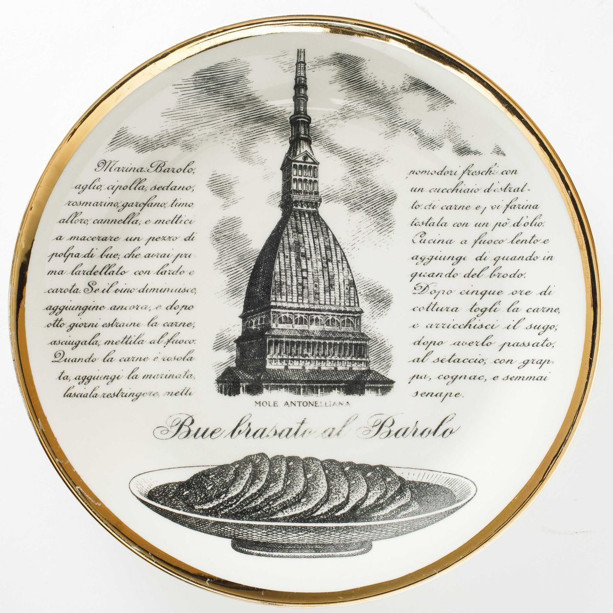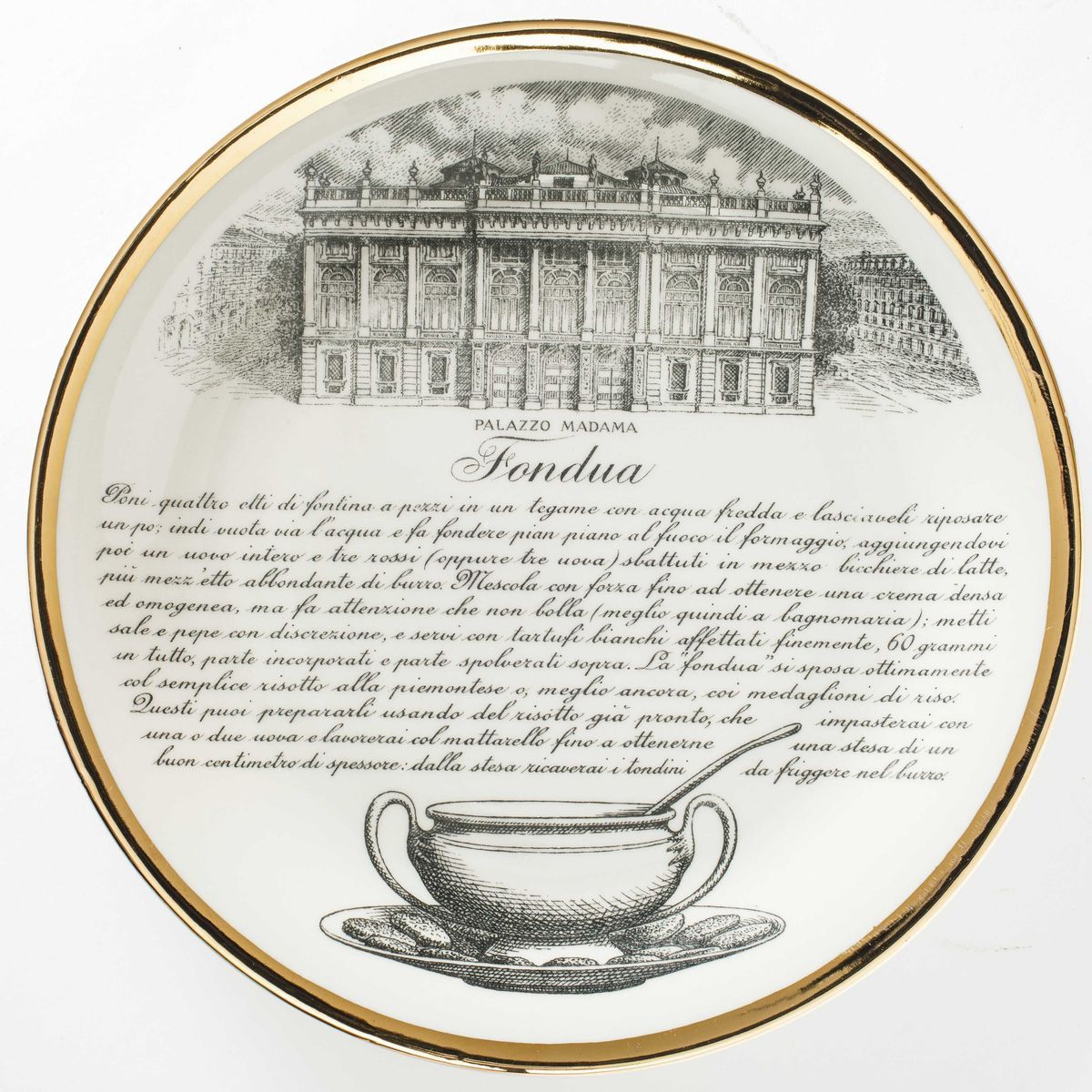 Lotto di sei piatti con ricette gastronomiche serie Specialità Torinesi in porcellana con decoro serigrafato e bordo in oro.