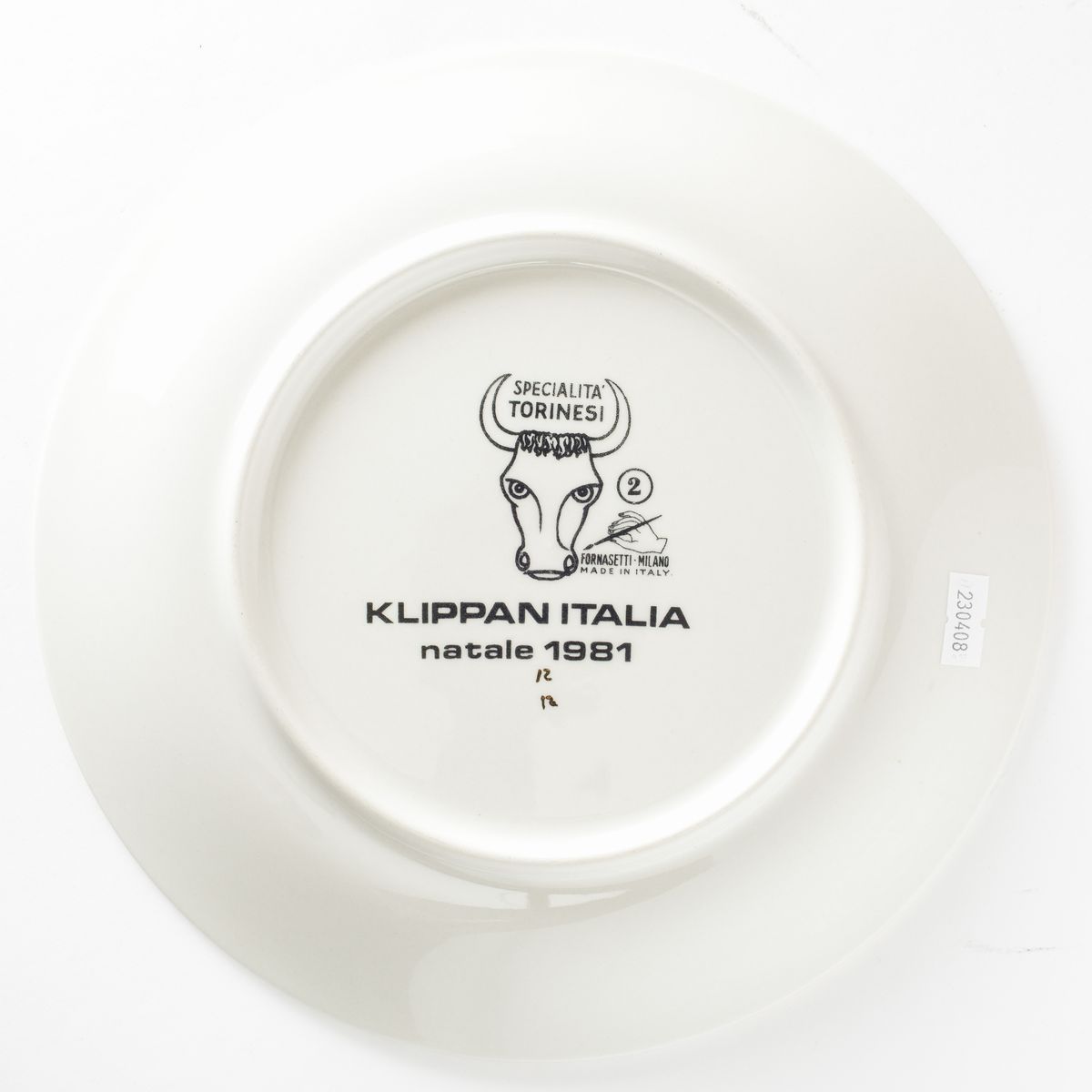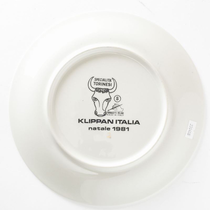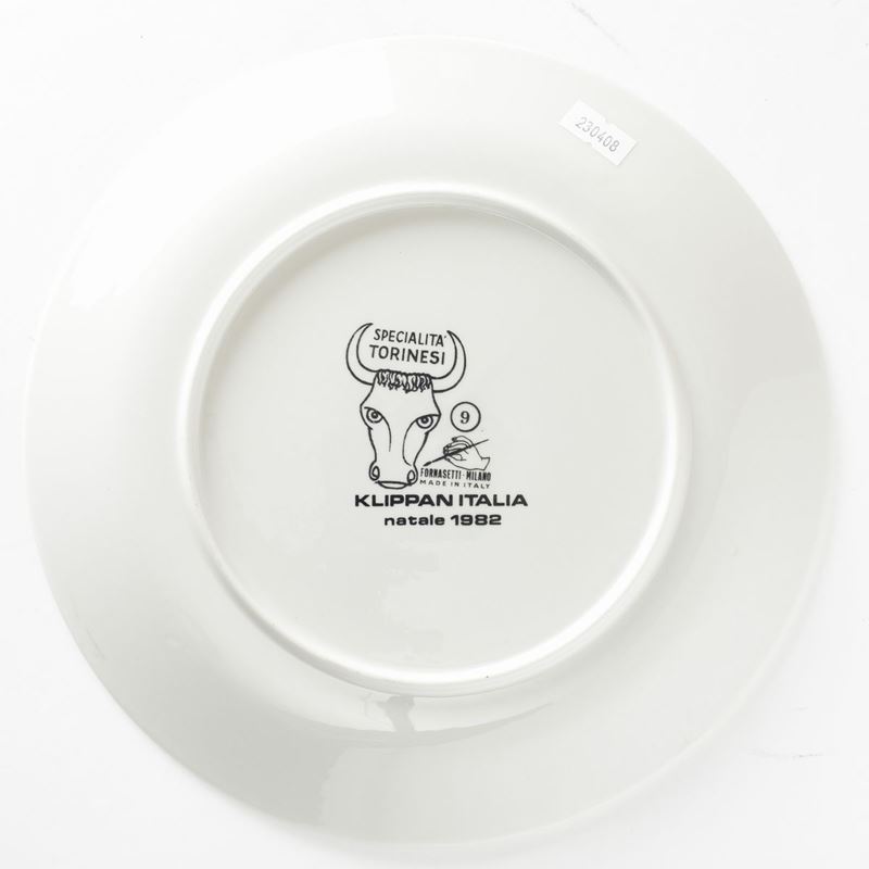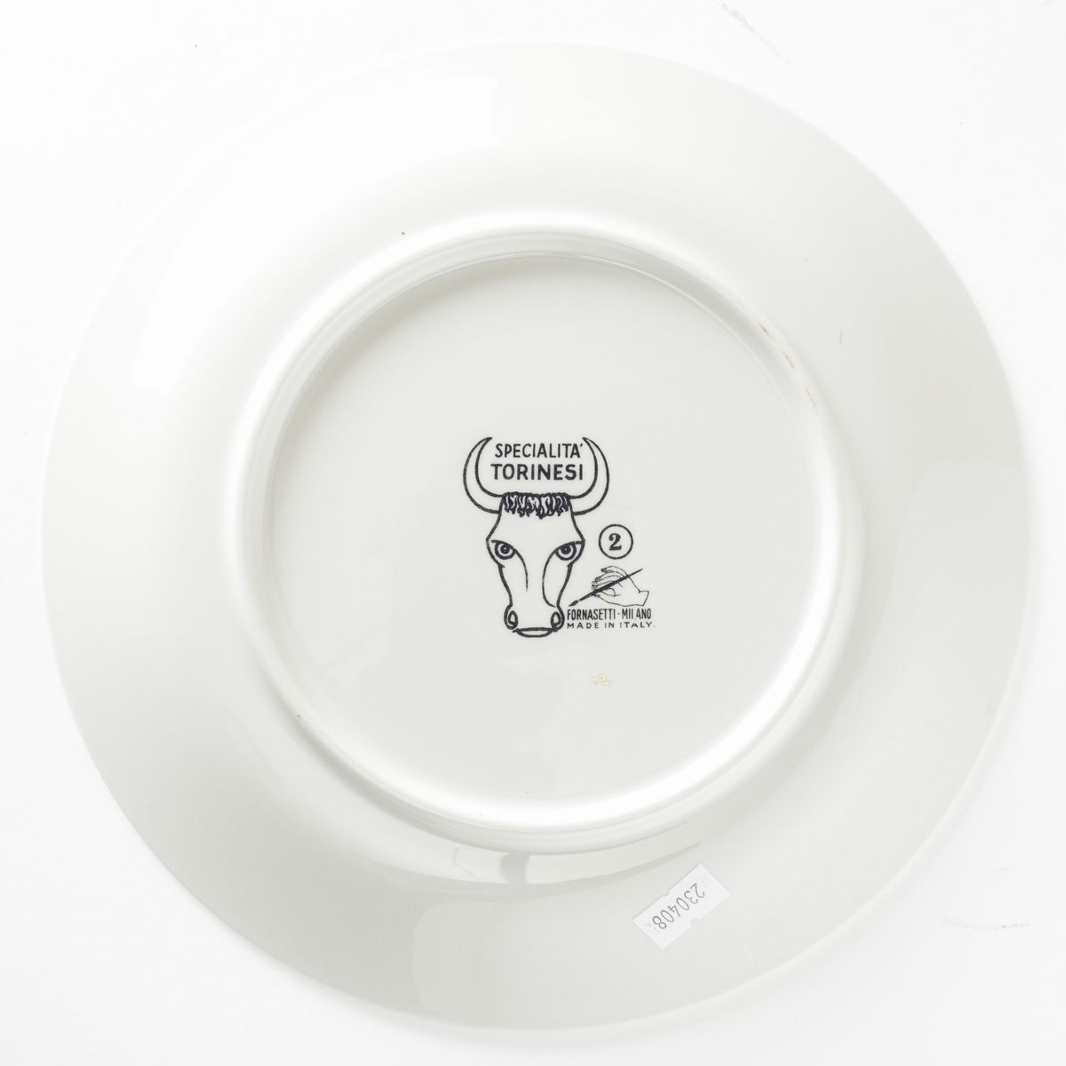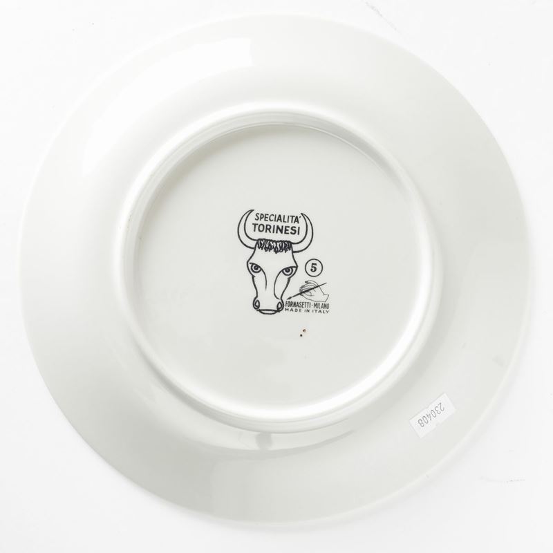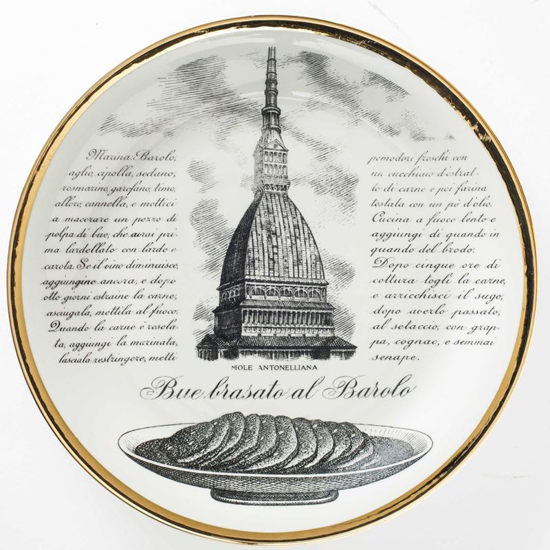 Lotto di sei piatti con ricette gastronomiche serie Specialità Torinesi in porcellana con decoro serigrafato e bordo in oro.