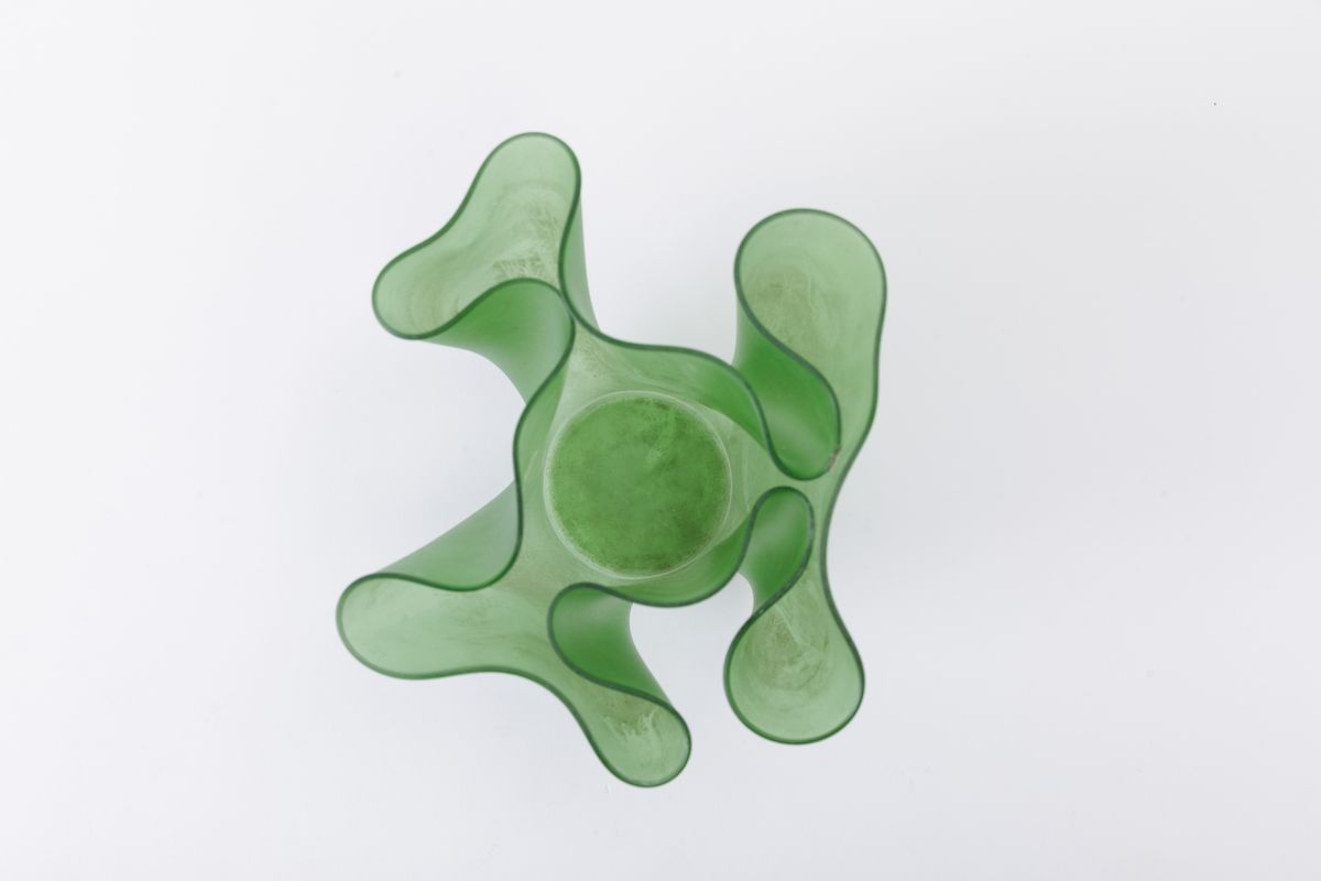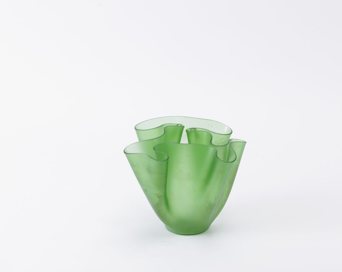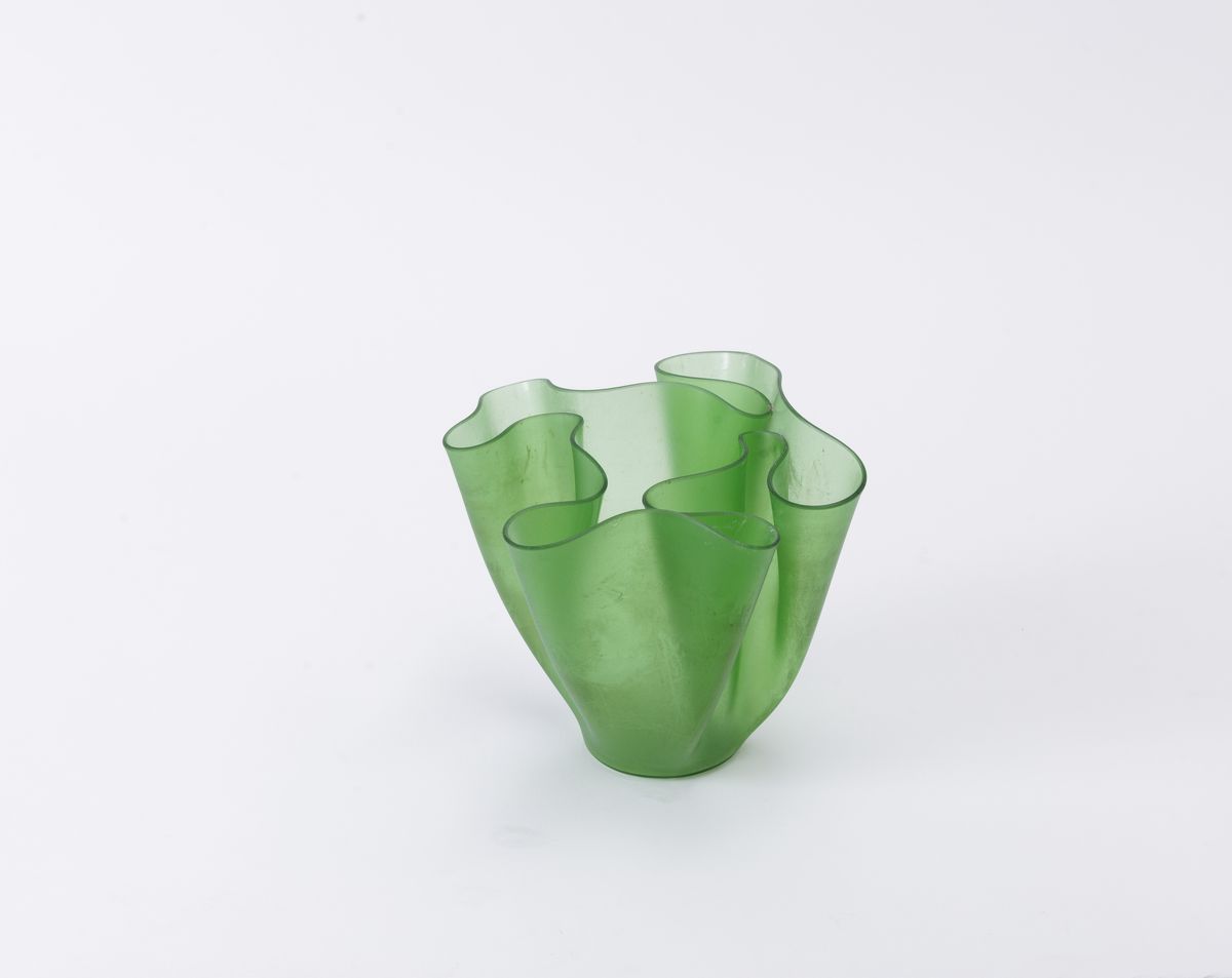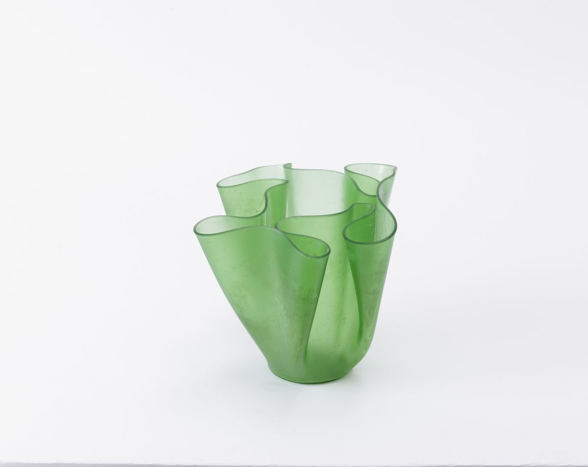 Vaso a fazzoletto formato da foglio di cristallo lavorato a caldo verde satinato.