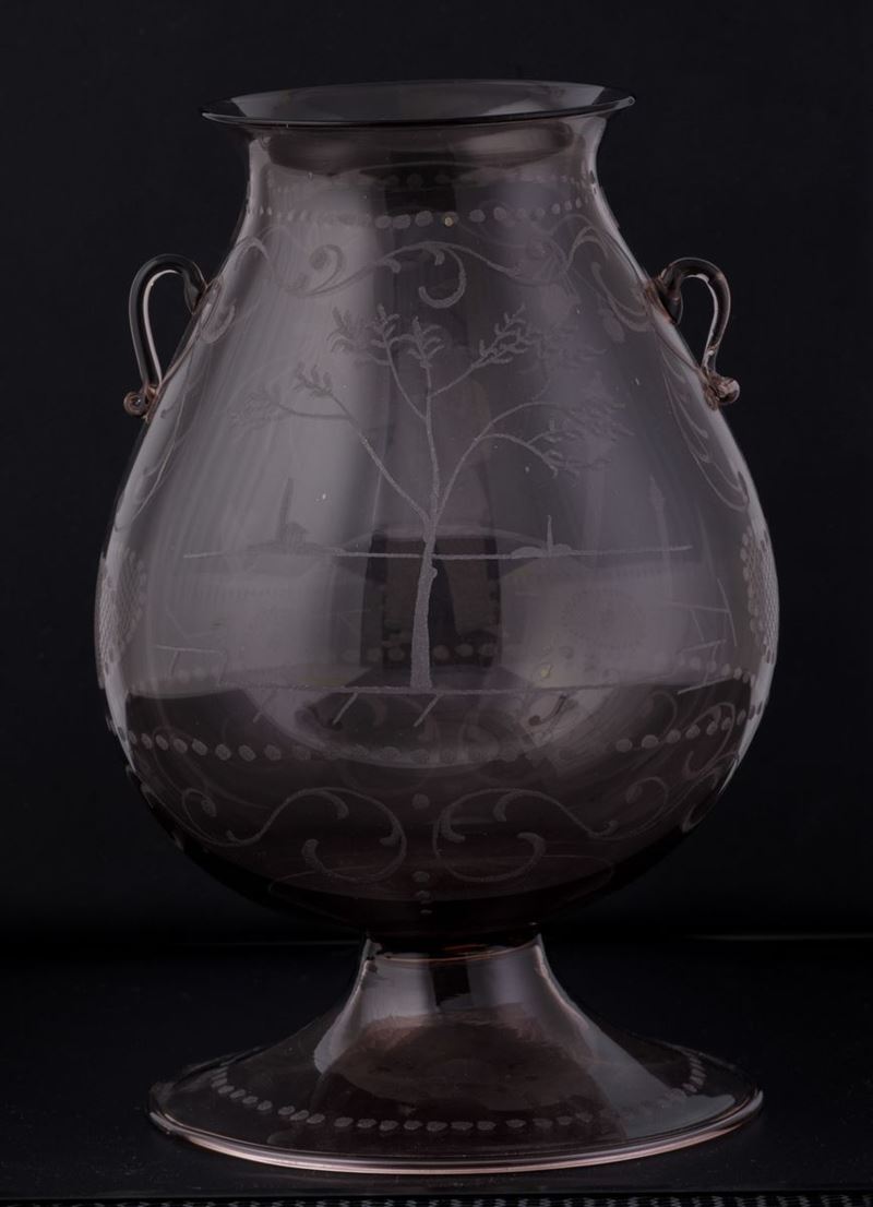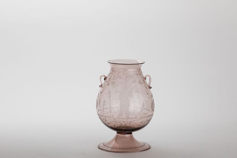 Vaso a goccia con bocca svasata su ampio piede in vetro soffiato ciclamino con anse applicate con decoro di figura carnevalesca incisa e motivi vegetali.
