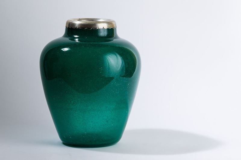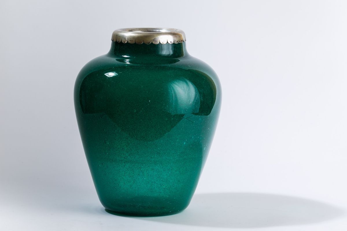 Grande vaso in vetro soffiato verde con decoro di bollicine. Imboccatura coperta da ghiera in argento.