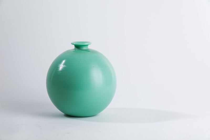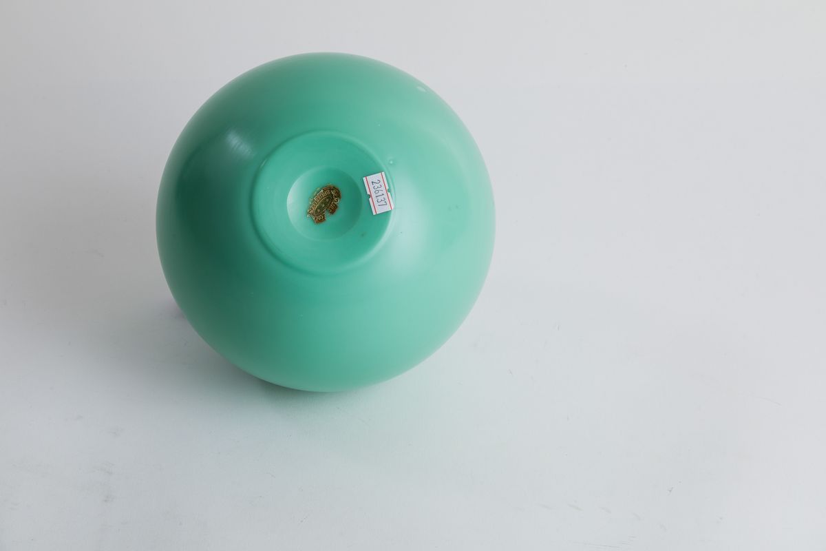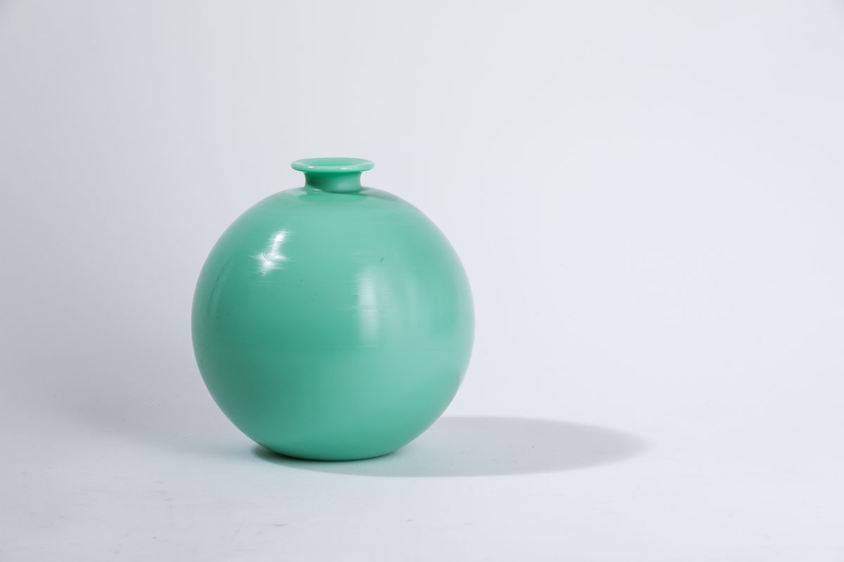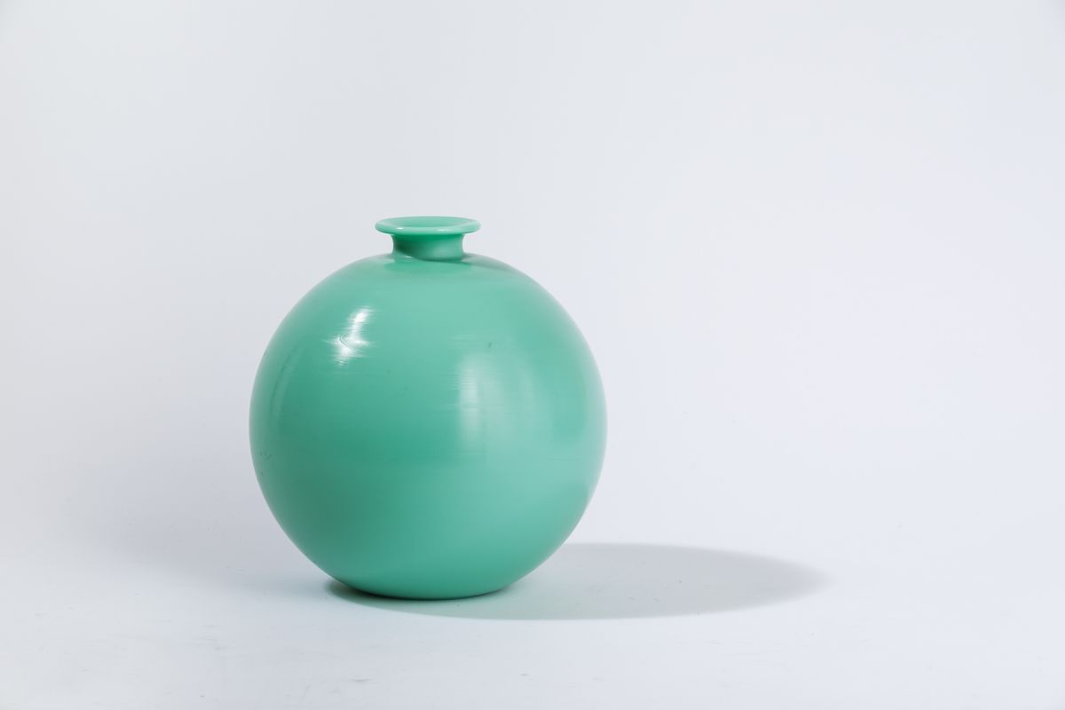 Vaso a sfera con piccolo collo in vetro opalino turchese opaco. Superficie interamente lavorata alla mola.