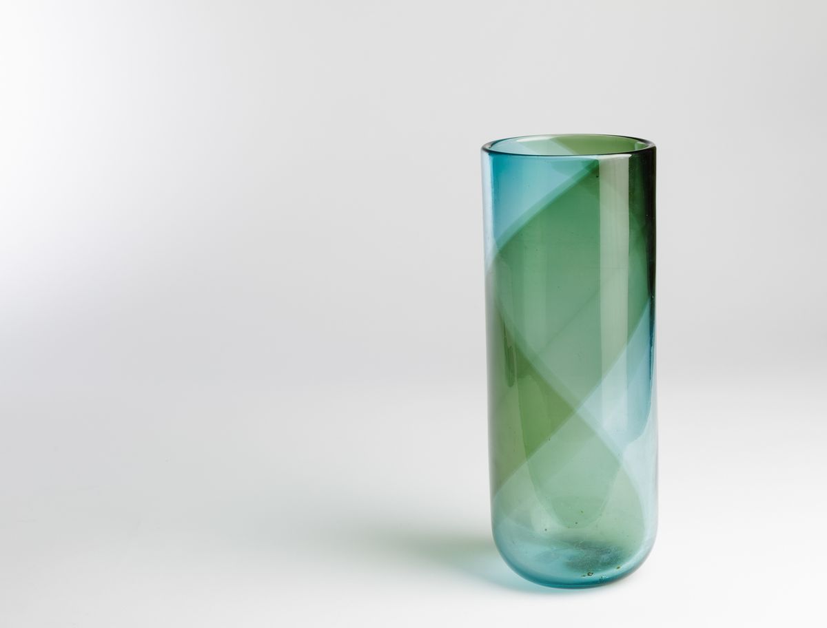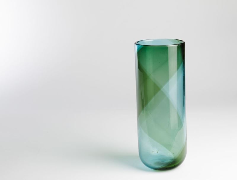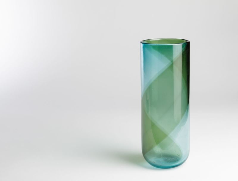 Vaso cilindrico serie Coreani in vetro con decoro di spirale azzurra verde.