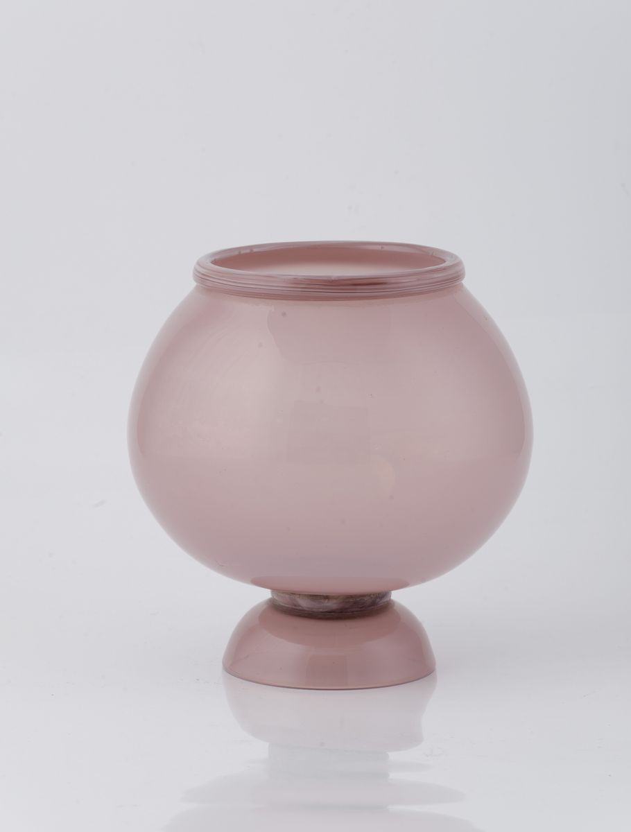 Raro vaso globulare su piede a mezza sfera in vetro ciclamino traslucido e cordoni in vetro calcedonio applicati.