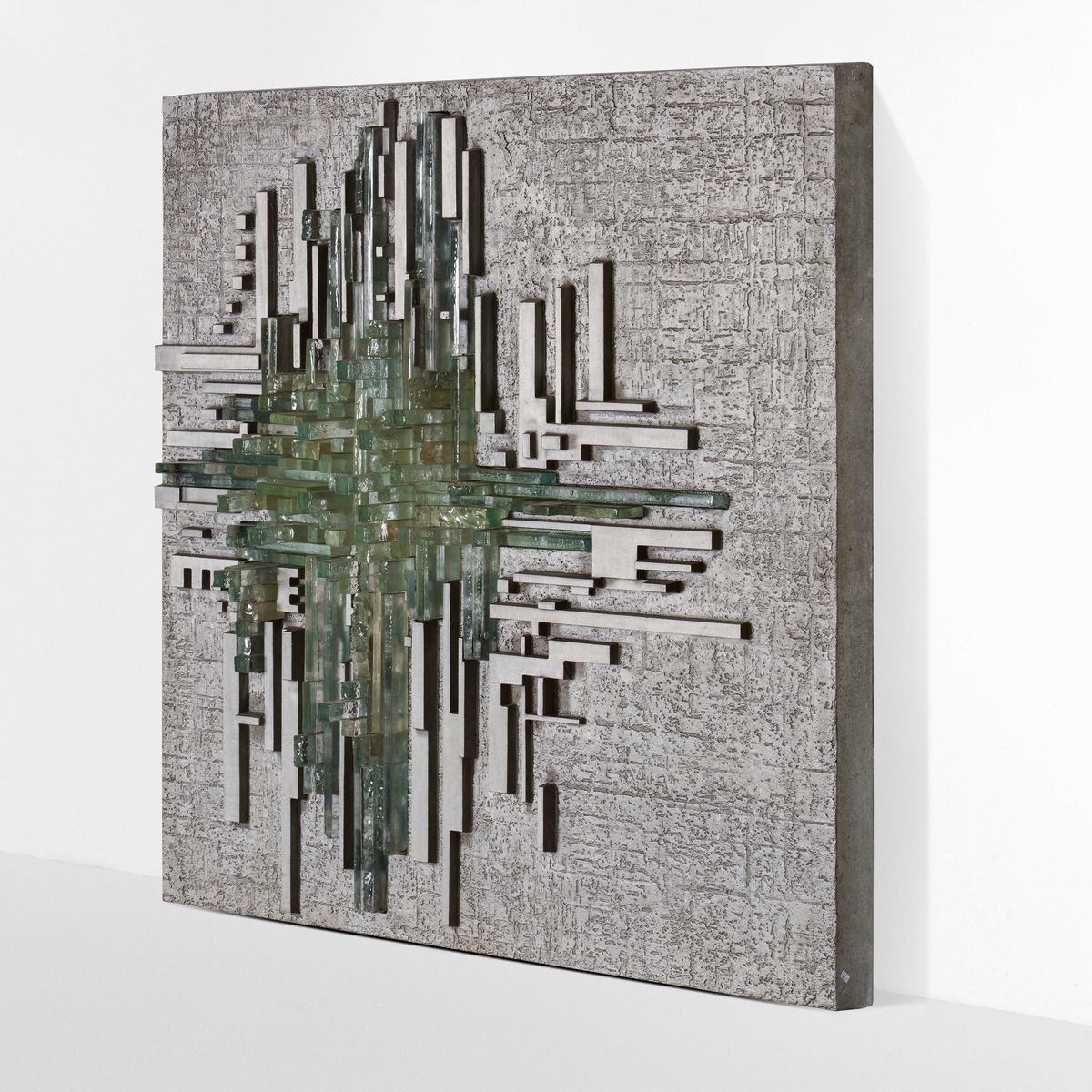 Pannello luminoso con struttura in alluminio pressofuso e inclusioni in vetro.