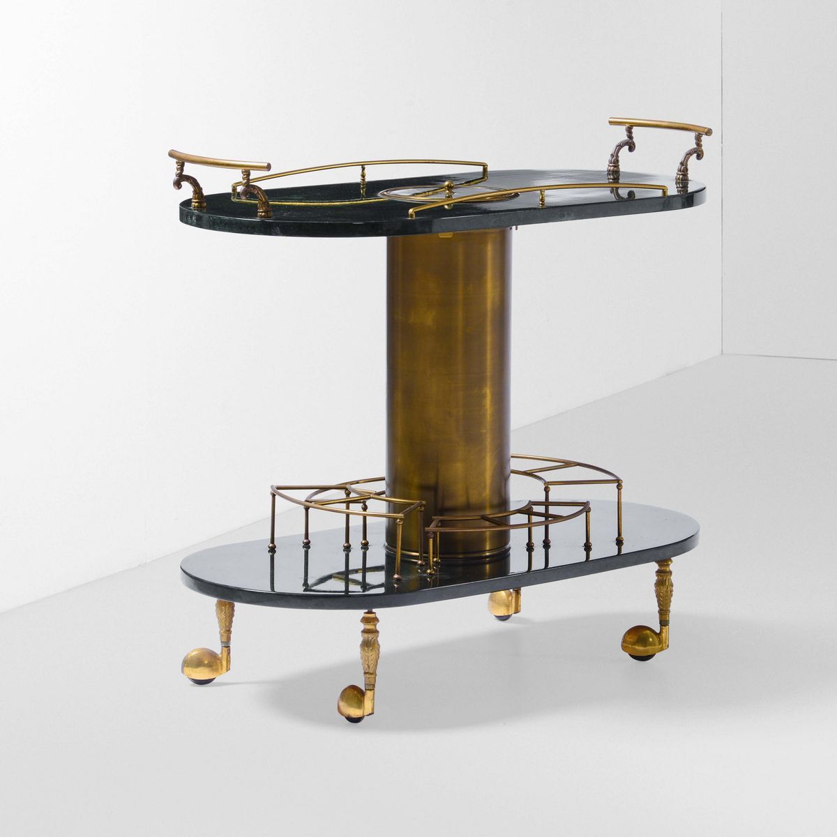 Carrello con struttura in ottone, ruote e piani in legno rivestito in pergamena laccata.