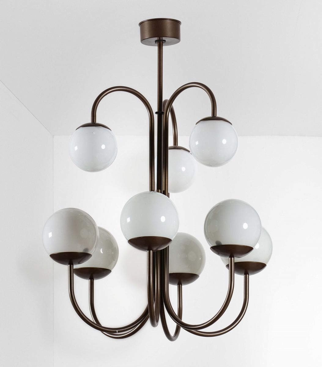 Lampada a sospensione con struttura in metallo brunito e diffusori in vetro opalino.