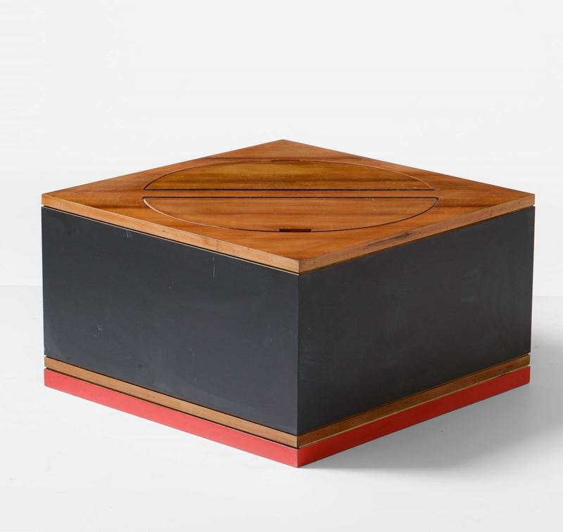 Tavolo basso con vano contenitore. Struttura in legno e laminato plastico.