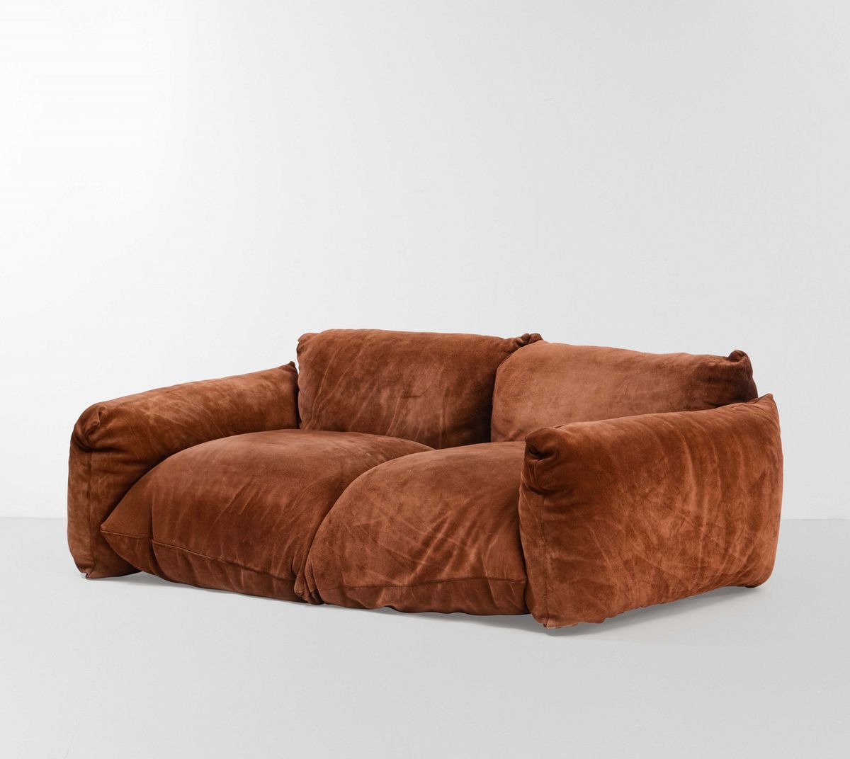 Divano mod. Marenco con struttura in metallo e rivestimenti in pelle scamosciata.