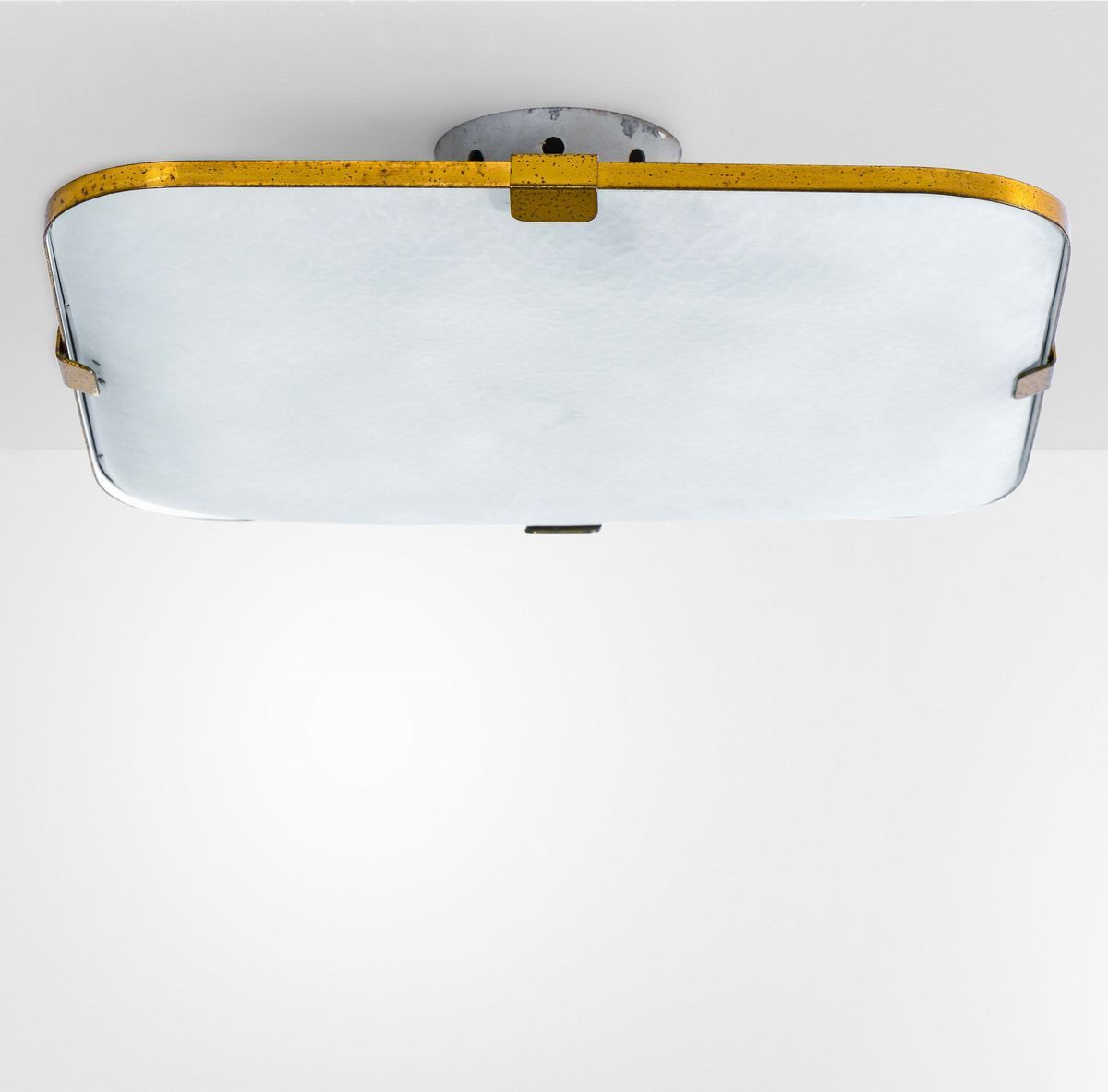Lampada a plafone mod. 1485/1 con struttura in metallo laccato, ottone e diffusore in vetro stampato curvato.