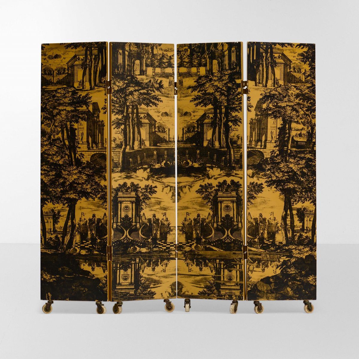 Paravento pieghevole su ruote con struttura in legno laccato e decoro serigrafato. Fantasia modello Trofei su un verso e Giardino Settecentesco sull'altro.