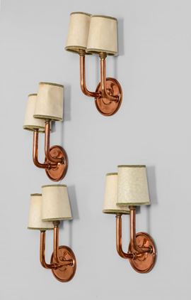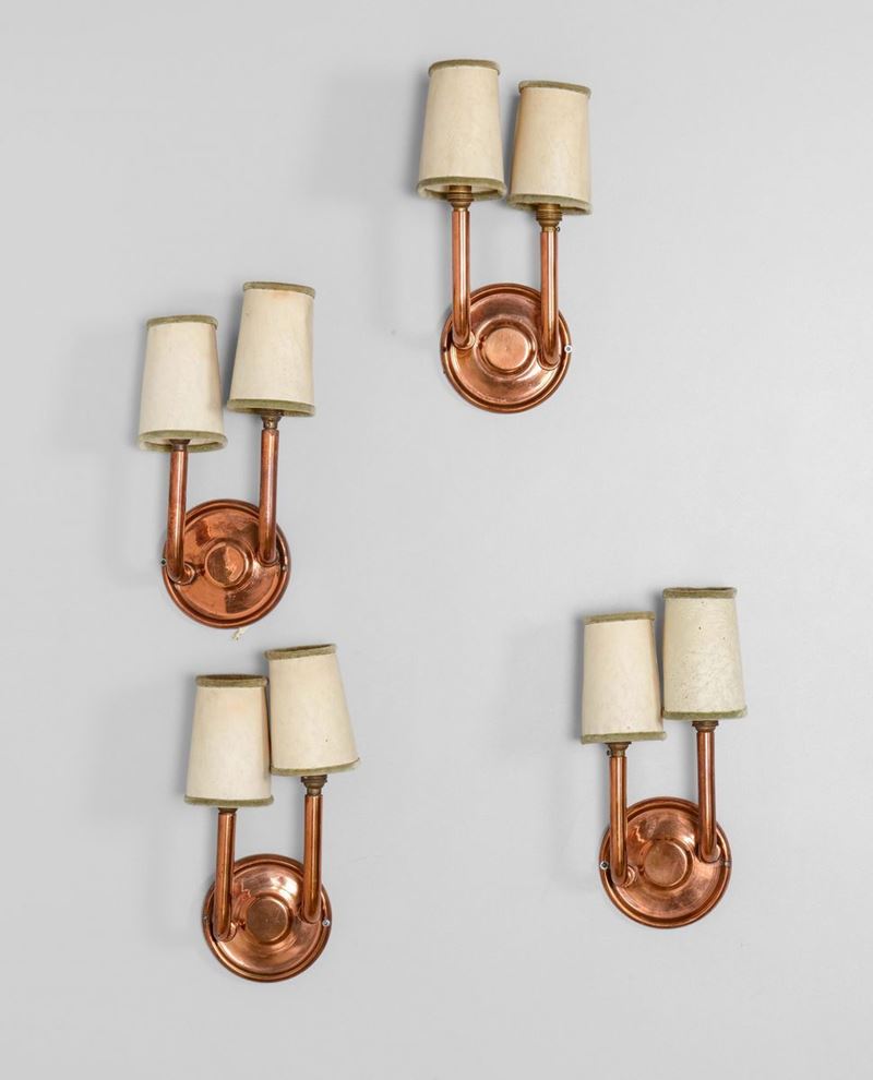 Quattro lampade a parete con struttura in rame e paralumi in tessuto.