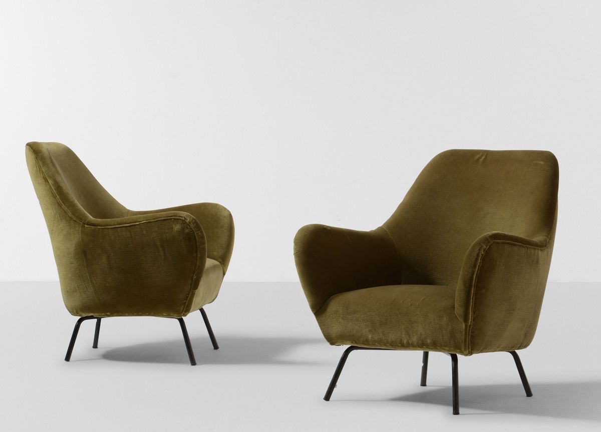 Salotto composto da coppia di poltrone e divano con struttura in legno, rivestimento in tessuto e sostegni in tubolare di [..]