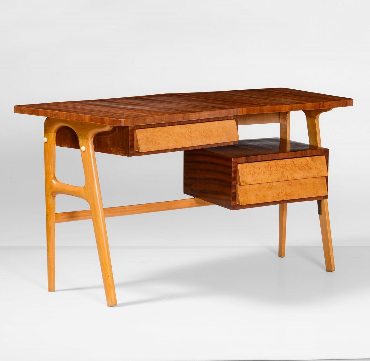 Scrivania con struttura, sostegni e piano in legno.