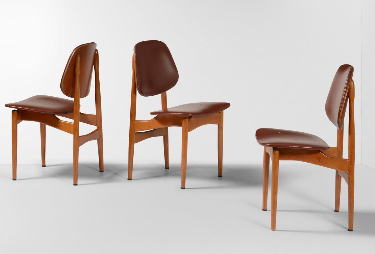 Sei sedie con struttura e sostegni in legno, rivestimento in pelle.