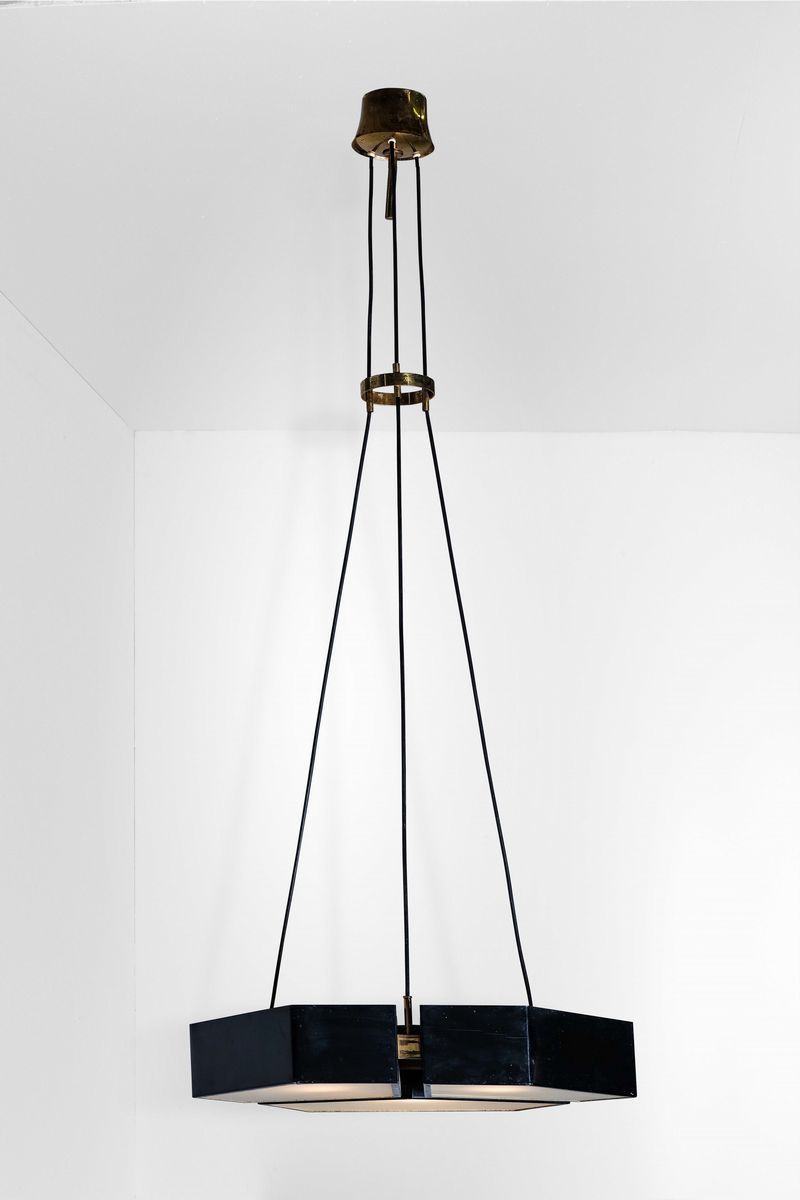 Lampada a sospensione con struttura in metallo laccato e ottone. Diffusori in vetro opalino