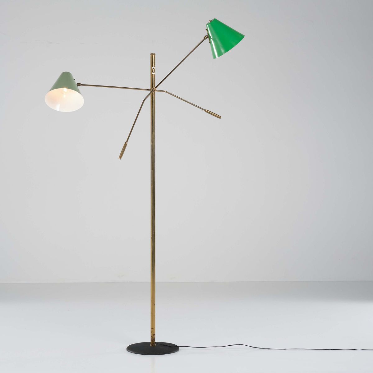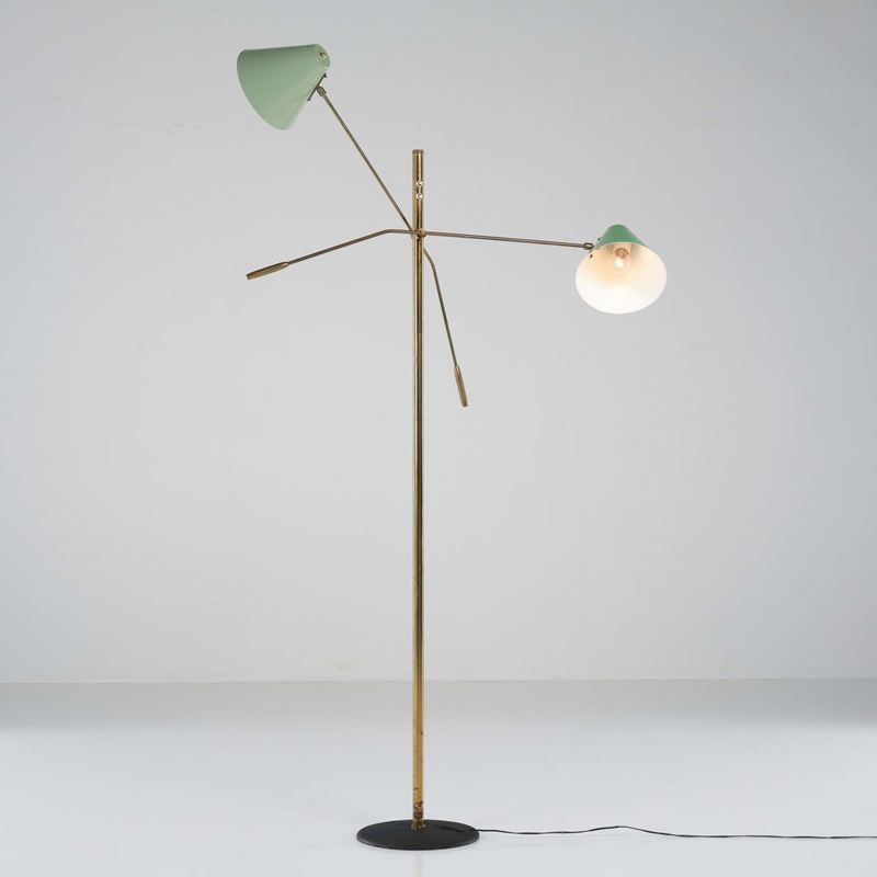 Lampada da terra con struttura in ottone e metallo laccato. Diffusore in alluminio laccato.