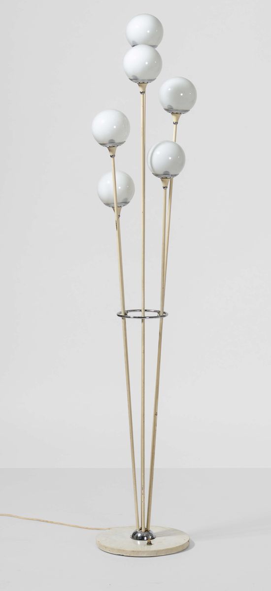 Lampada da terra Alberello con struttura in metallo laccato, particolari in metallo cromato, base in marmo e diffusori in vetro opalino.
