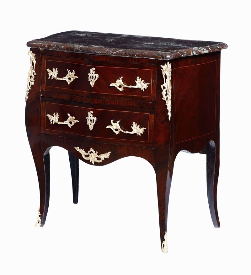 fronte e fianchi mossi, piano in marmo sagomato, applicazioni di bronzi dorati