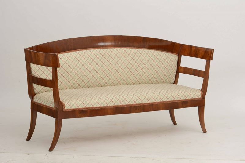 Coppia di divani lastronati in noce, inizio XIX secolo