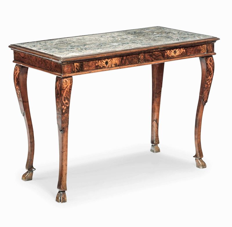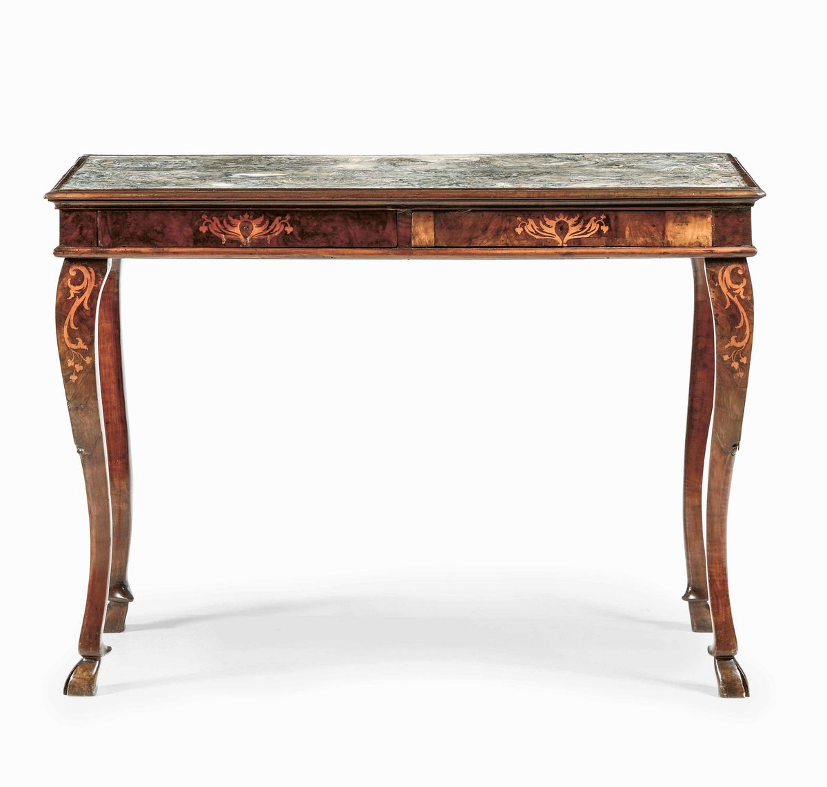 due cassetti sulla fascia, gambe arcuate terminanti con piede caprino, piano in marmo, cm 111x55x82