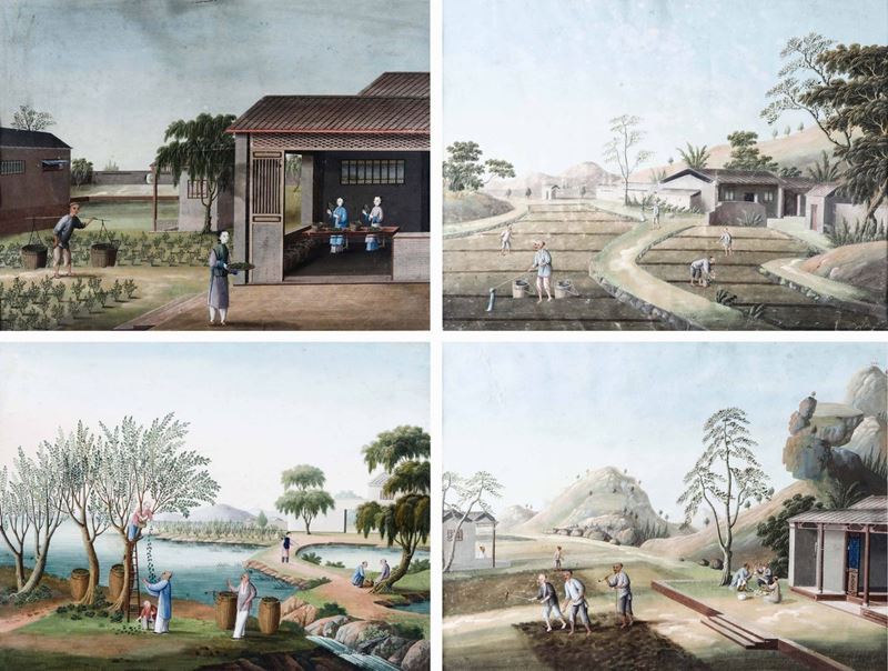 Due dipinti su carta raffiguranti scene di vita comune con contadini, Cina, Dinastia Qing, XIX secolo
