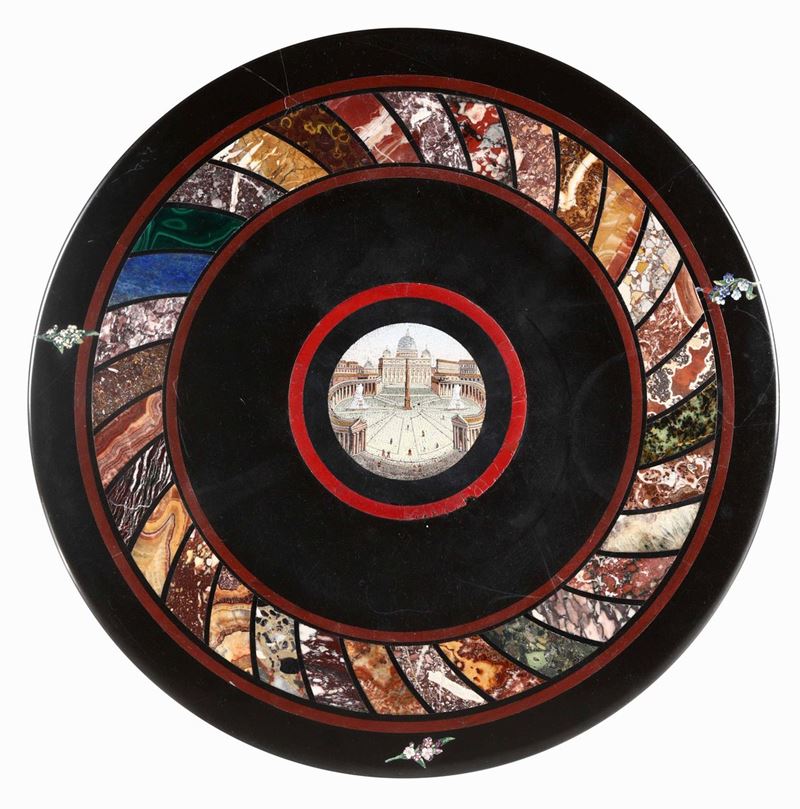 Piano circolare intarsiato e lastronato in marmi policromi e micromosaico al centro. XIX secolo