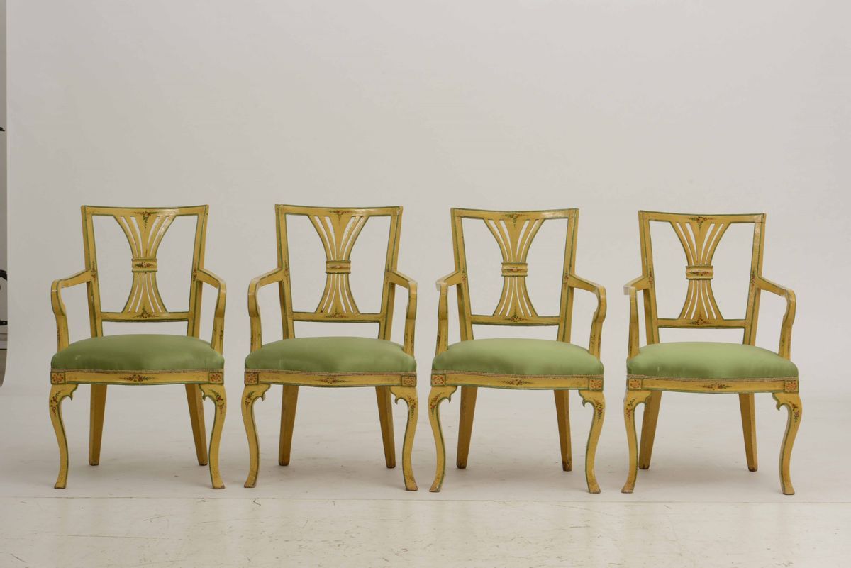 Salotto composto da divano e quattro poltrone in legno dipinto, Venezia fine XVIII secolo