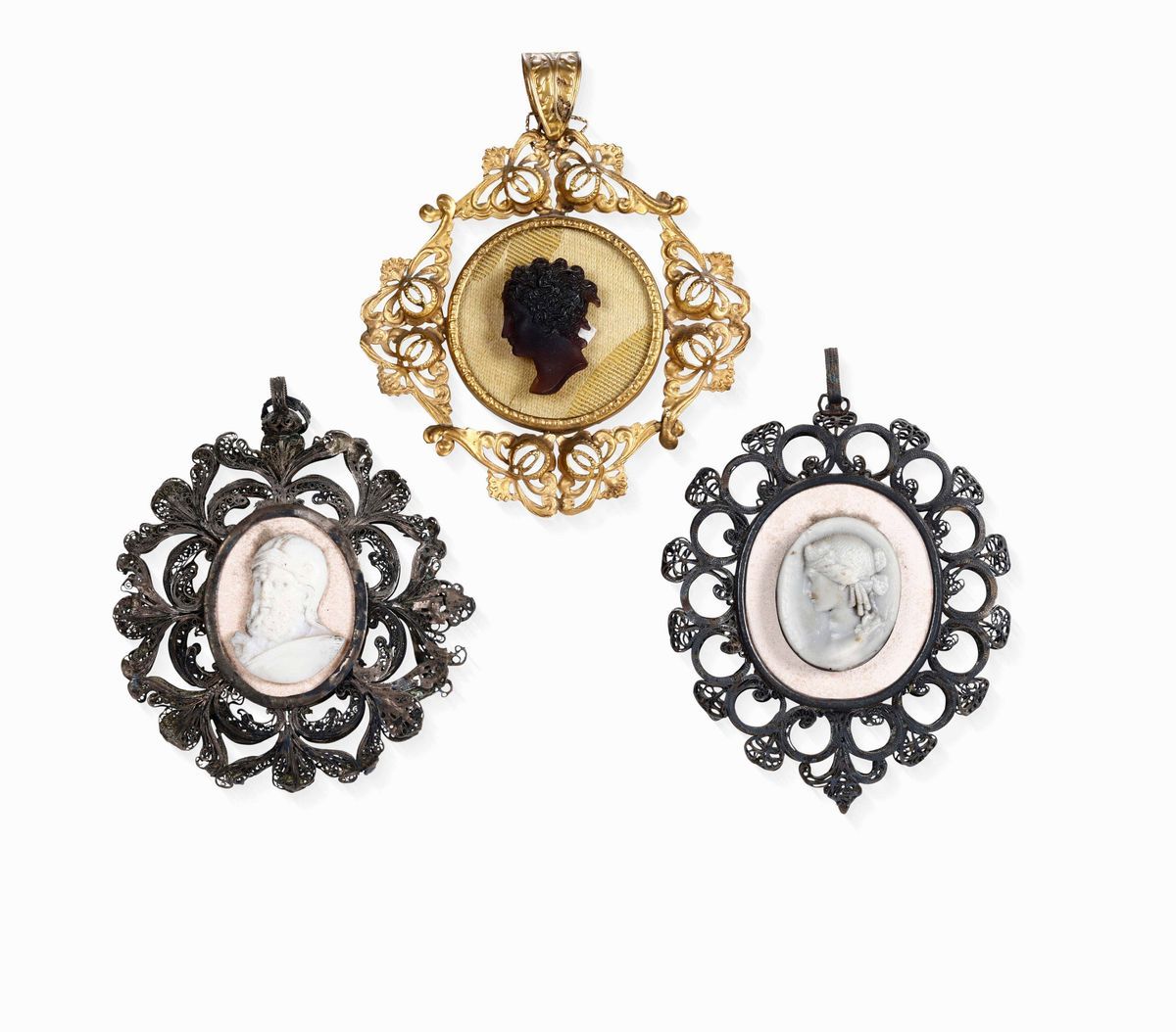 Tre pendenti in filigrana d'argento contenenti cammei di gusto classico Italia XIX secolo