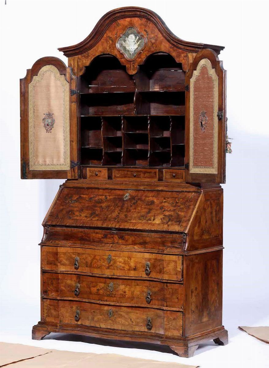 parte inferiore mossa a tre cassetti sormontati da una calatoia celante cassettini e vani a giorno, il corpo superiore, a due ante con specchio inciso, piede a mensola, cm 123x55x232