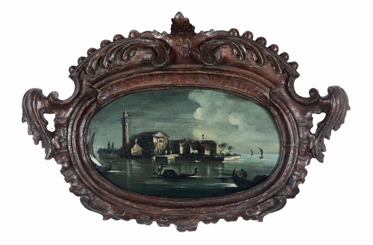 coppia di dipinti a olio su tavoletta, cm 40x23, in cornici coeve
