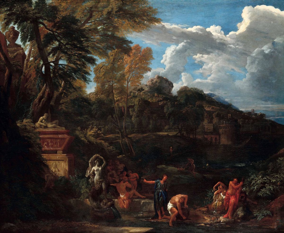 Pieter Rijsbraeck (Anversa 1655 - Buruxelles 1729) Paesaggio con scena di baccanale