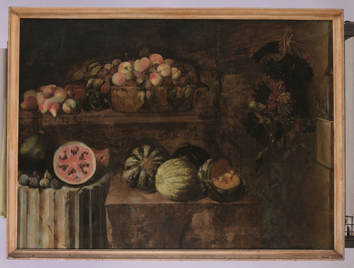 Scuola toscana del XVII secolo Natura morta con frutta e architetture
