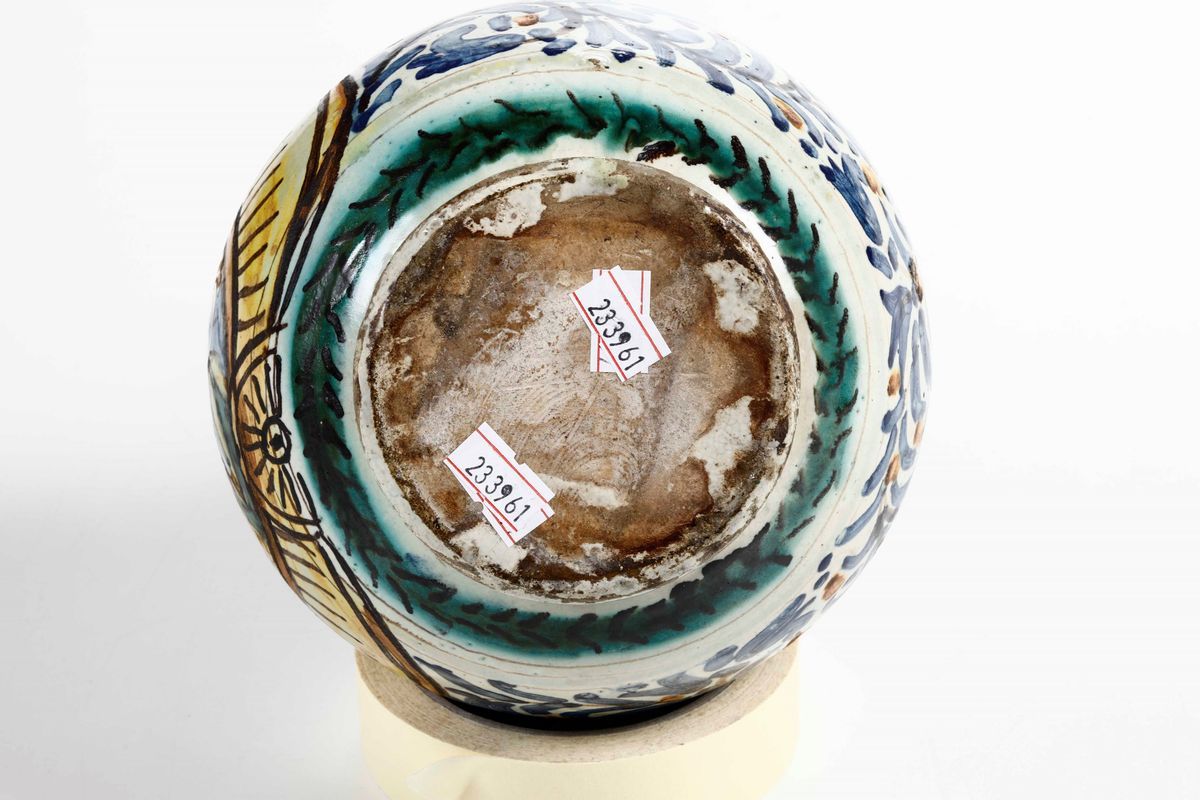 Maiolica decorata in policromia a gran fuoco. Altezza cm 24. Conservazione: ottima; insignificanti sbeccature al bordo superiore