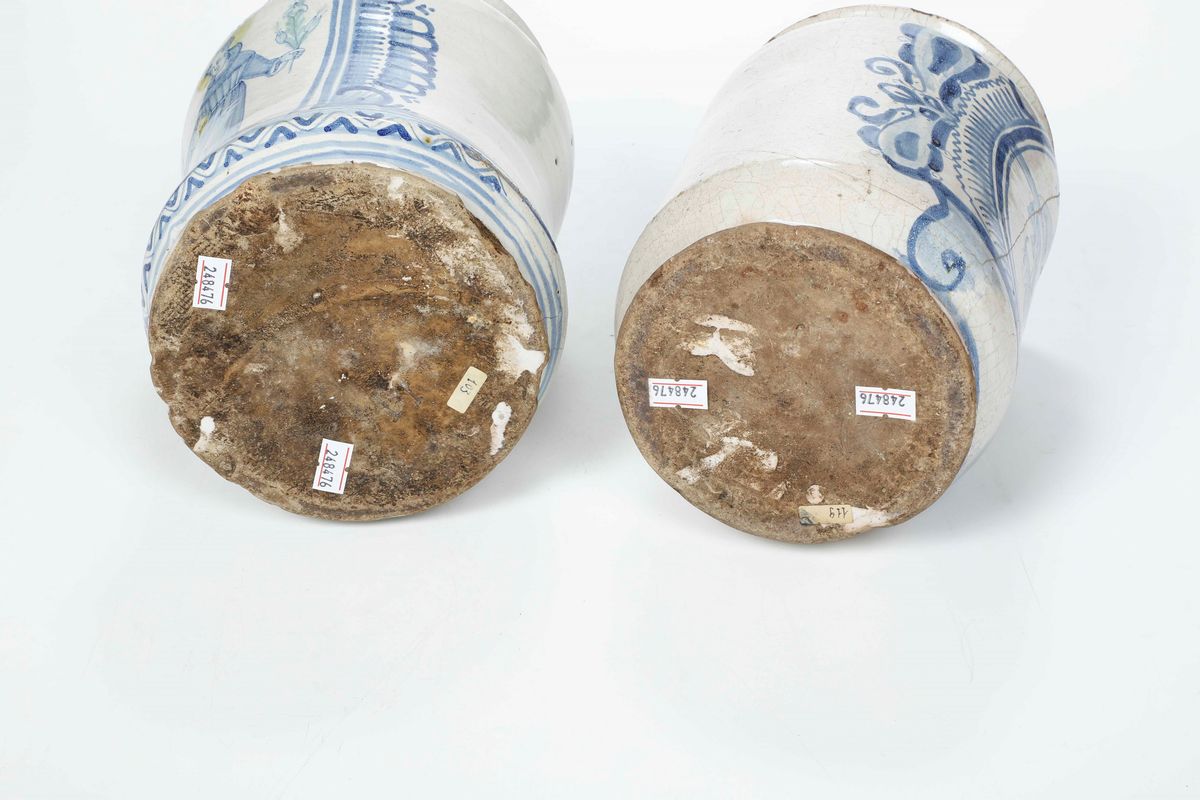 Maiolica. Altezza cm 22 circa. Conservazione: ottima; un pezzo con sbeccature all’orlo superiore e felature; l’altro con minima sbeccatura al bordo della base, leggere felature e craquelures