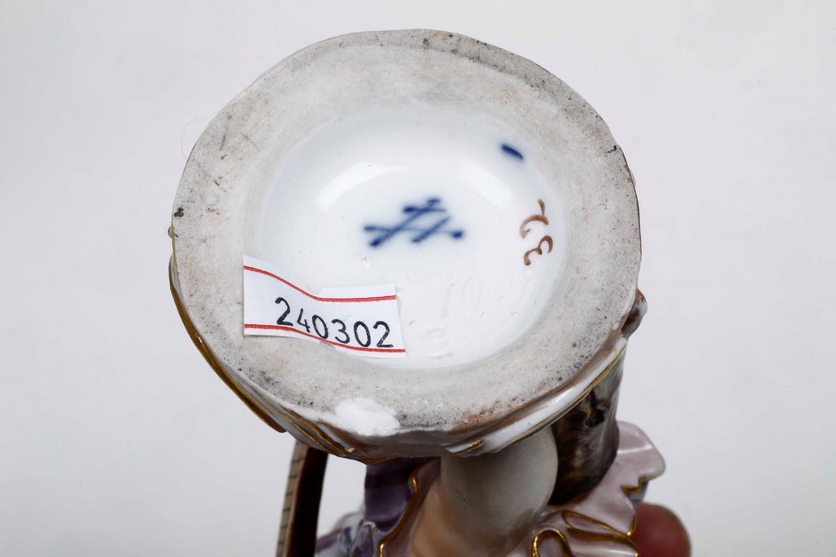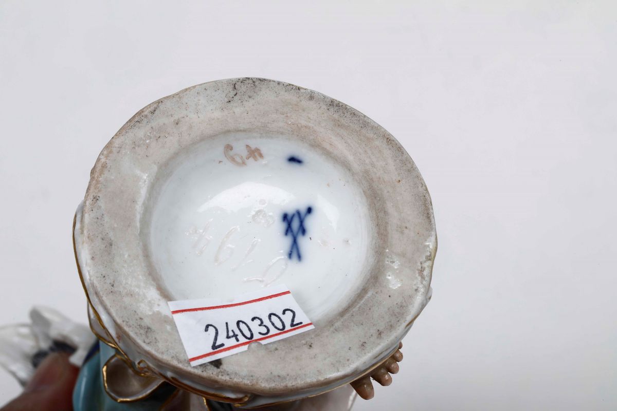 Porcellana policroma e dorata. Marca: spade in blu; numeri incisi. Altezza cm 16; cm 16,5 circa. Conservazione: il putto con strumento presenta due sbeccature alla base; l’altro ha un’ala rotta in due frammenti rincollata